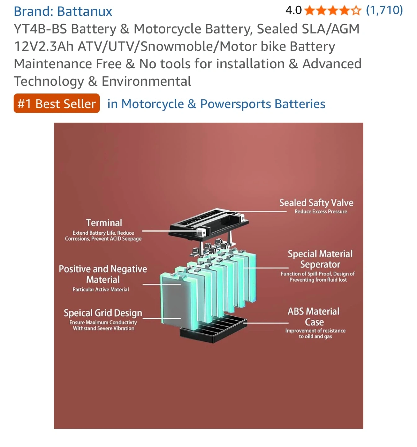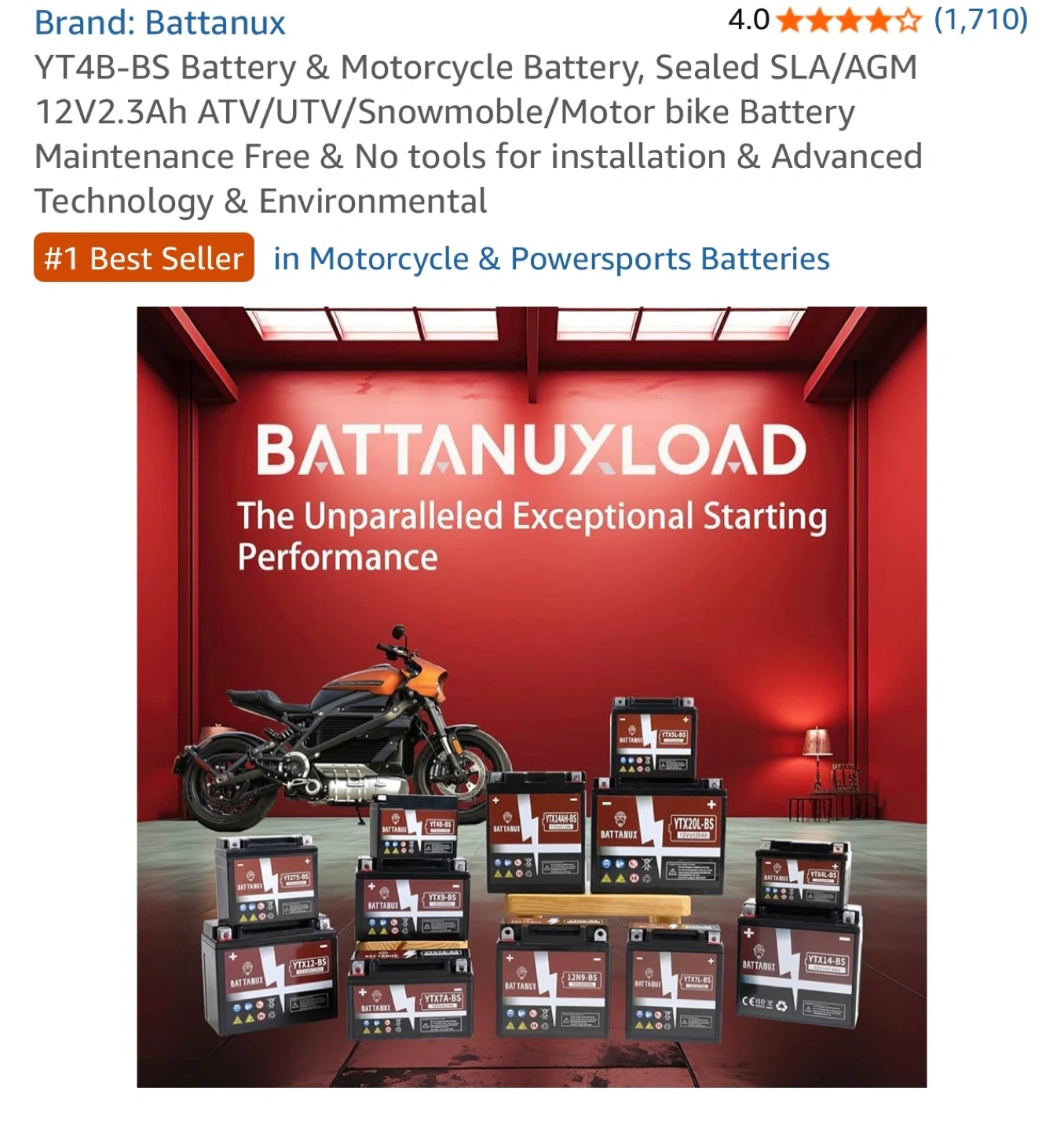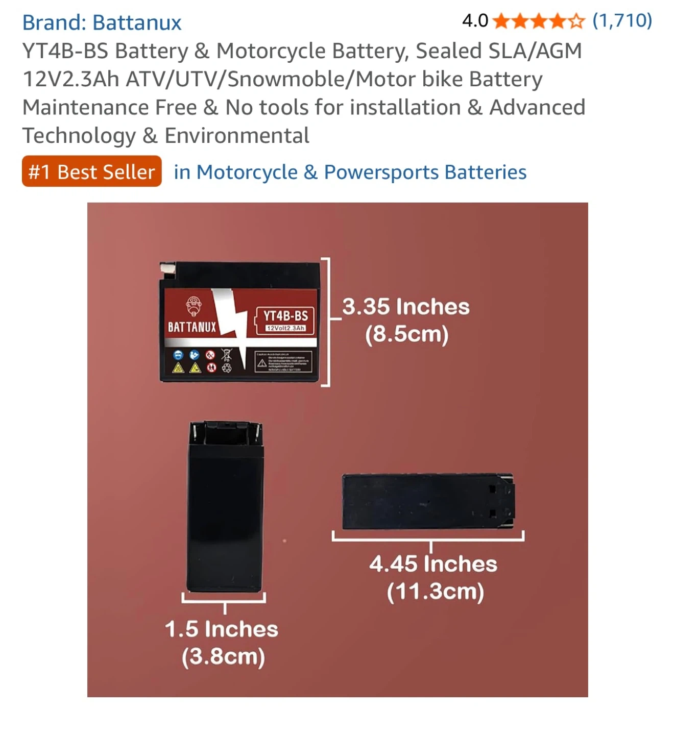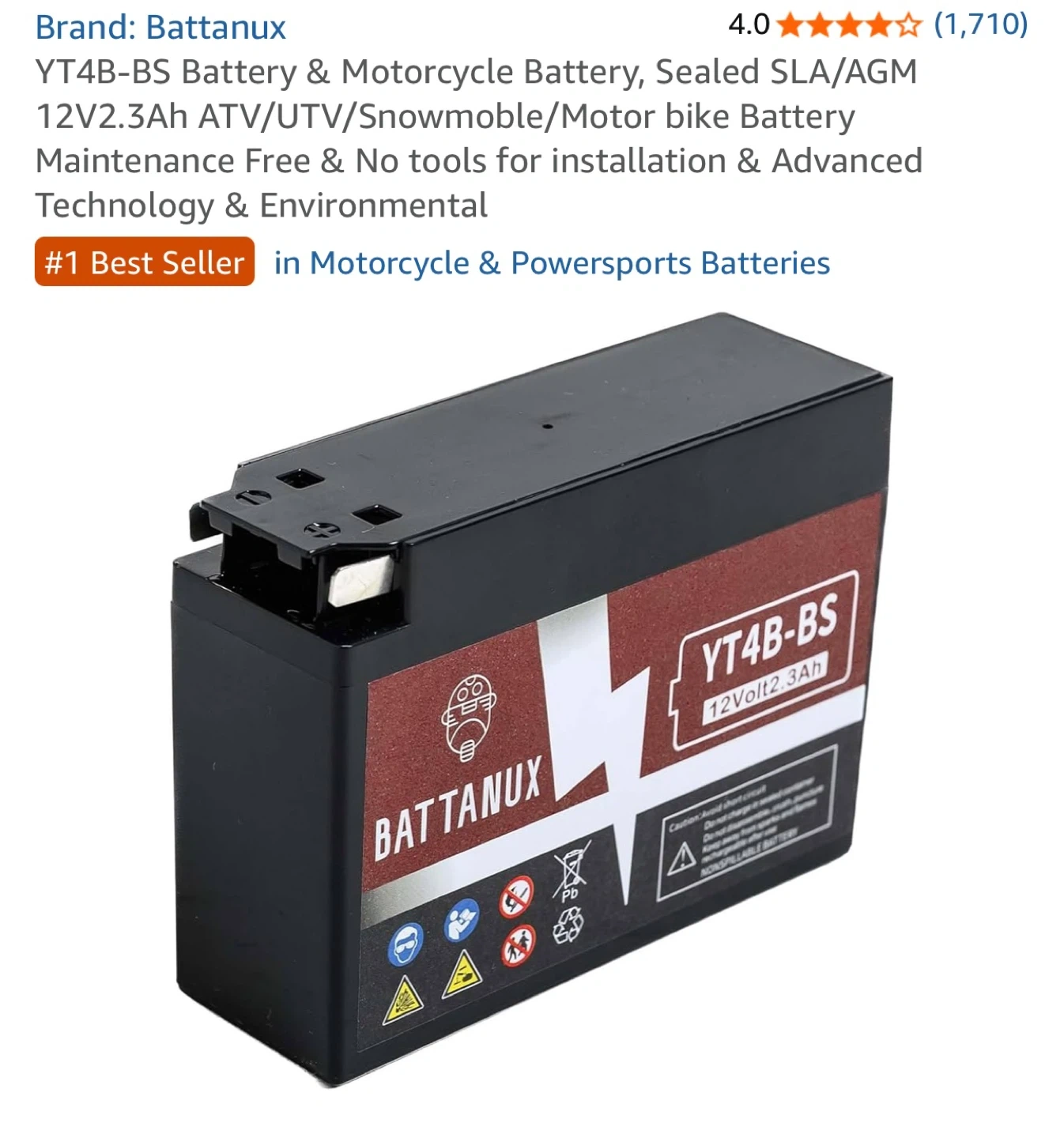 Selling a brand new Battanux YT4B-BS battery! It's a sealed SLA/AGM 12V 2.3Ah battery, perfect for ATVs, UTVs, snowmobiles, and motorcycles.