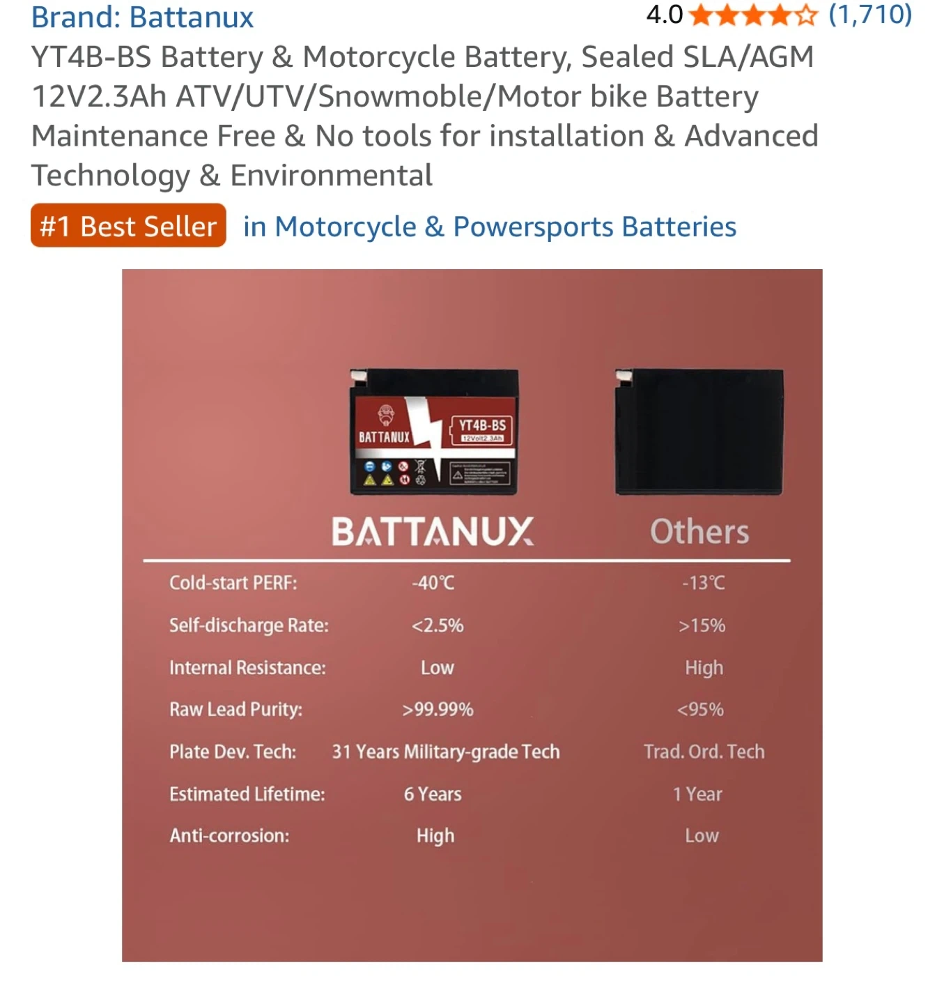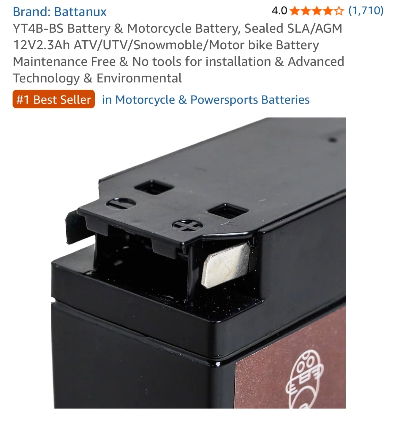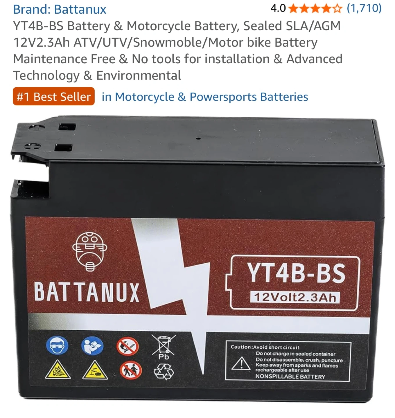Selling a brand new Battanux YT4B-BS battery! It's a sealed SLA/AGM 12V 2.3Ah battery, perfect for ATVs, UTVs, snowmobiles, and motorcycles.