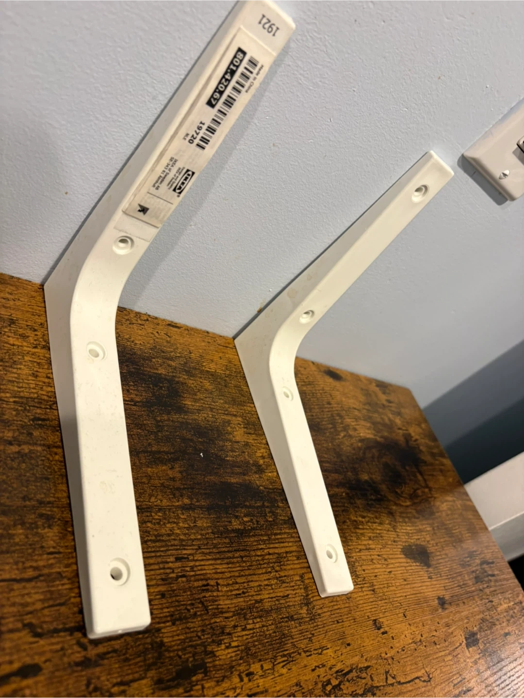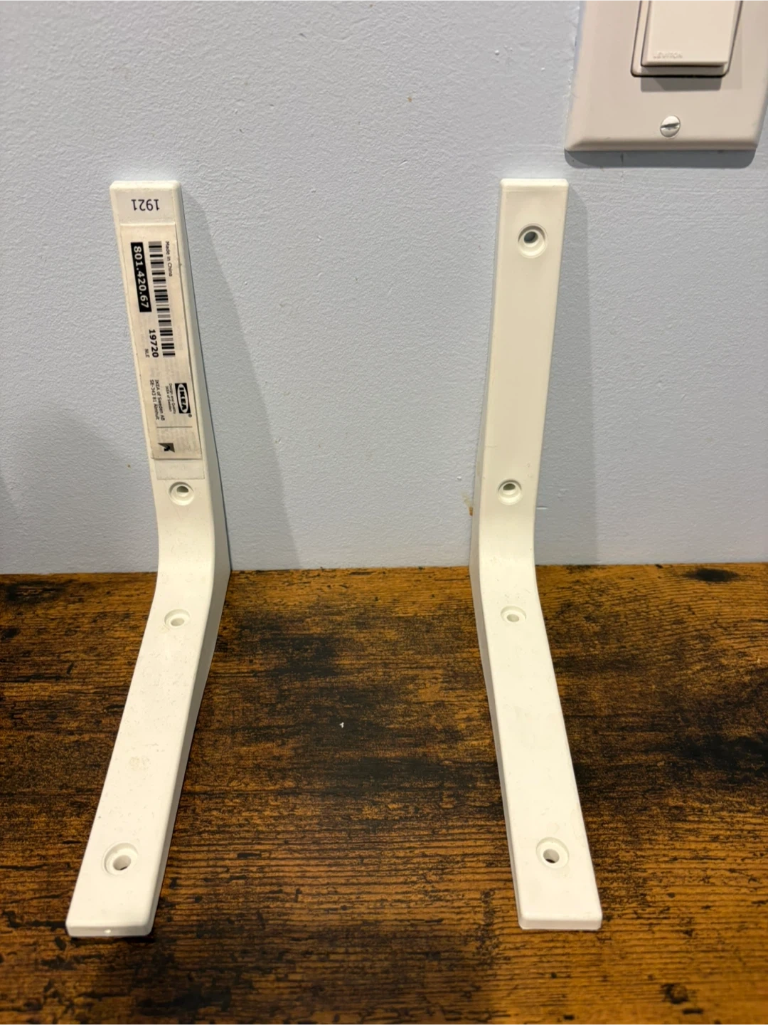 White IKEA plastic brackets, pair included. These are sturdy plastic brackets designed for mounting shelves. Each bracket has pre-drilled holes for secure installation. Great for organizing spaces at home or in the garage!