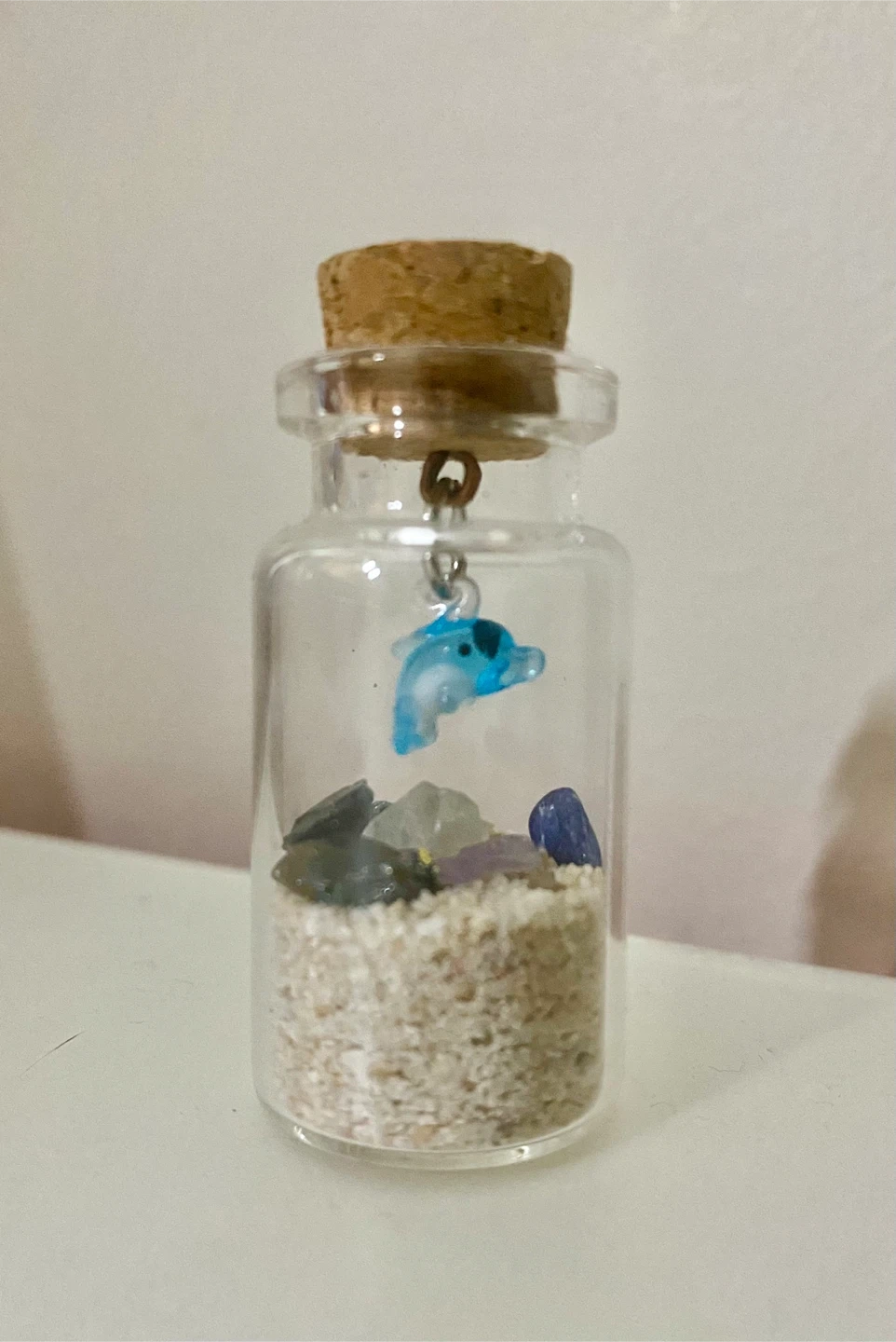 A small glass bottle with a cork stopper, filled with sand and tiny stones. Inside, there's a cute blue dolphin charm hanging from the cork. It's a unique and charming little decorative item!