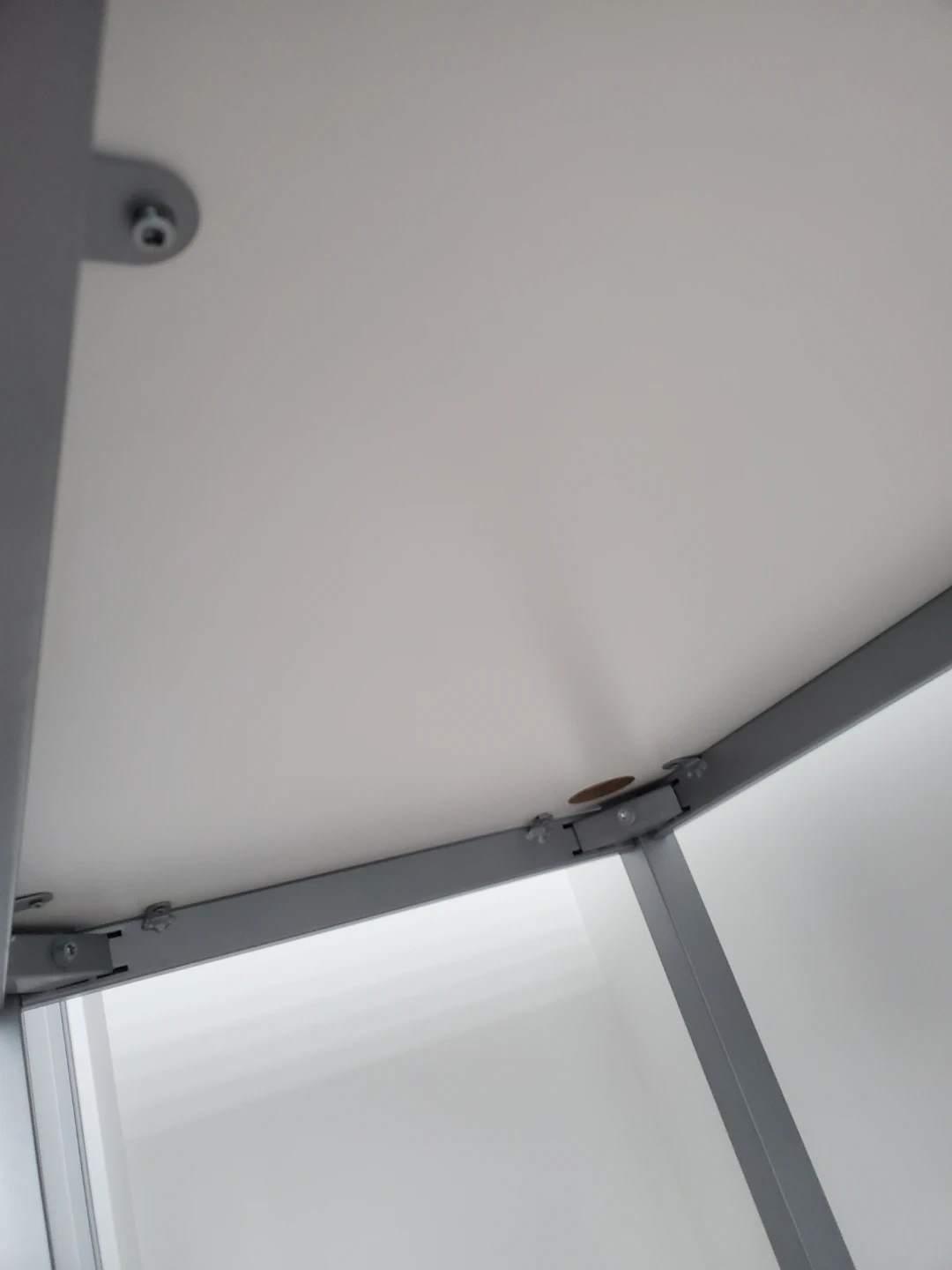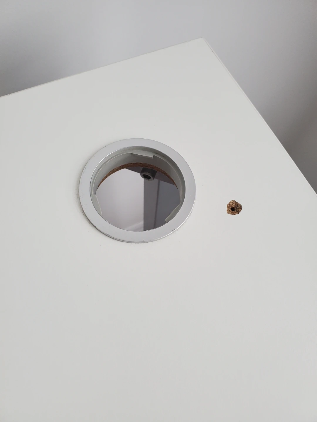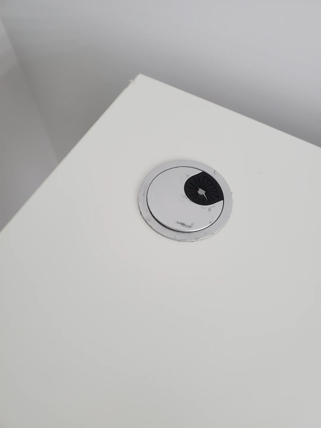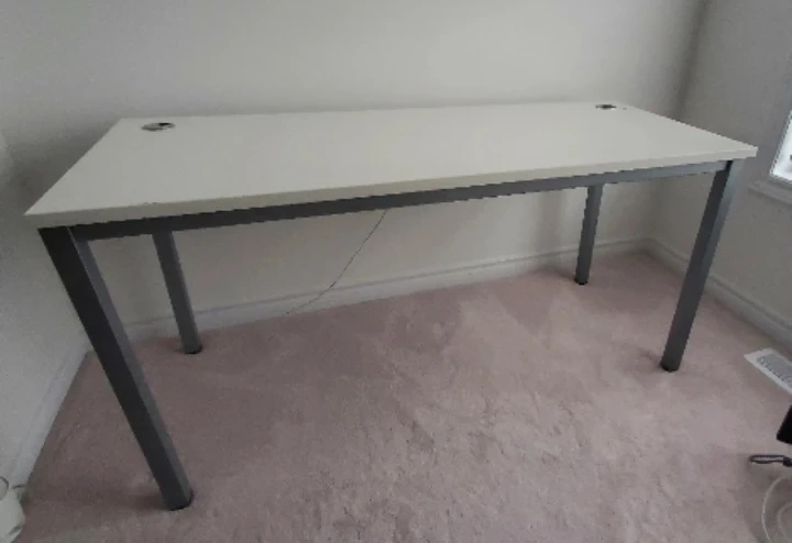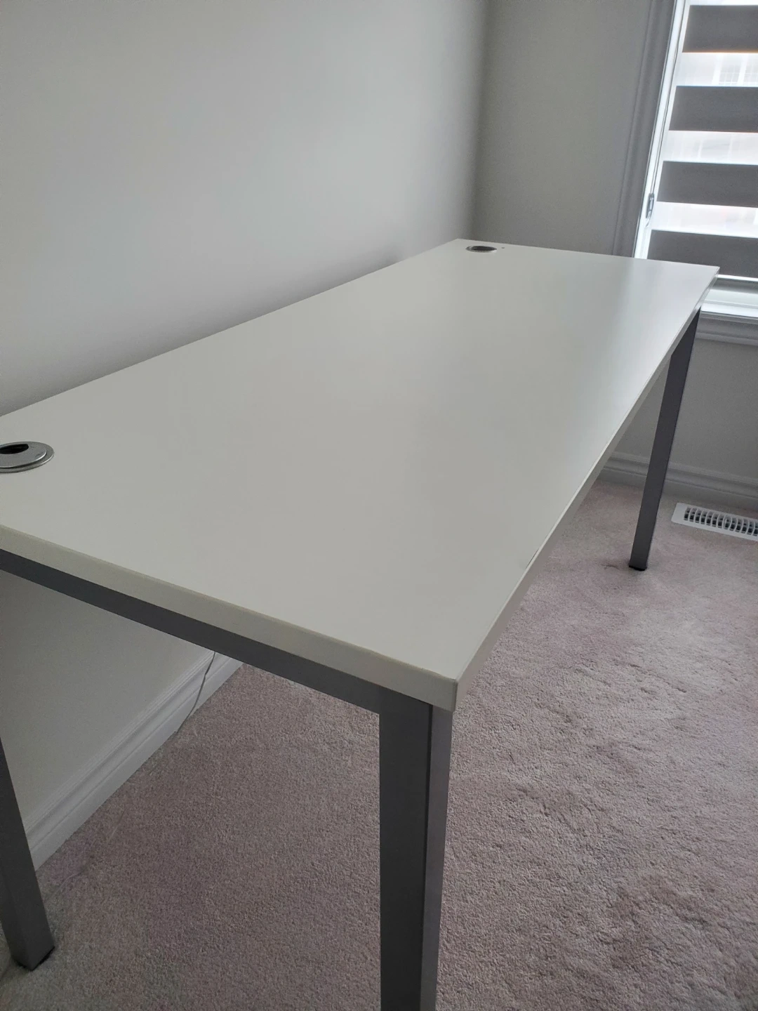 Used White desk with sturdy grey metal legs in good condition It features two grommet holes for cable management. Desk height measures approximately 29 .25 inches