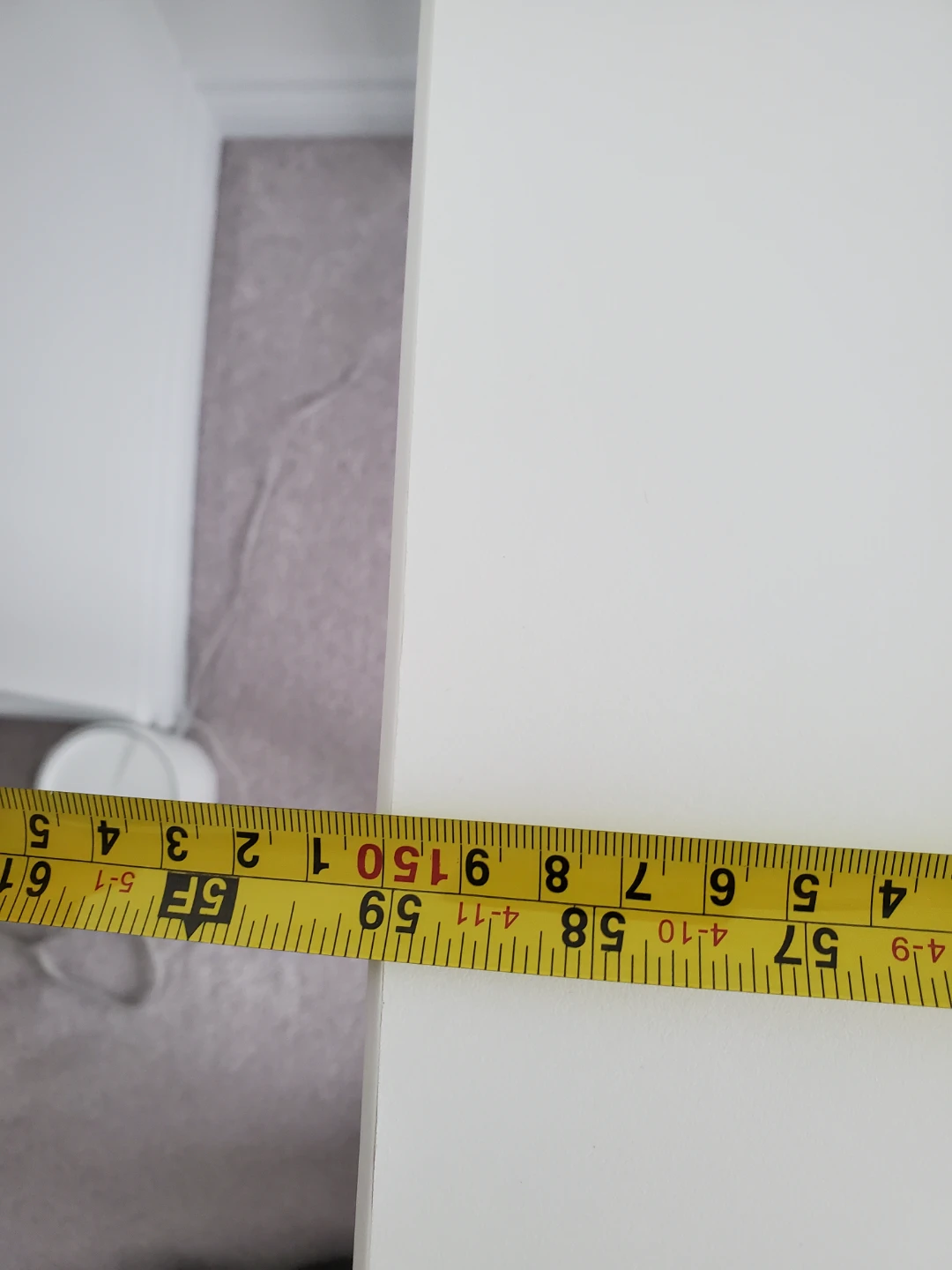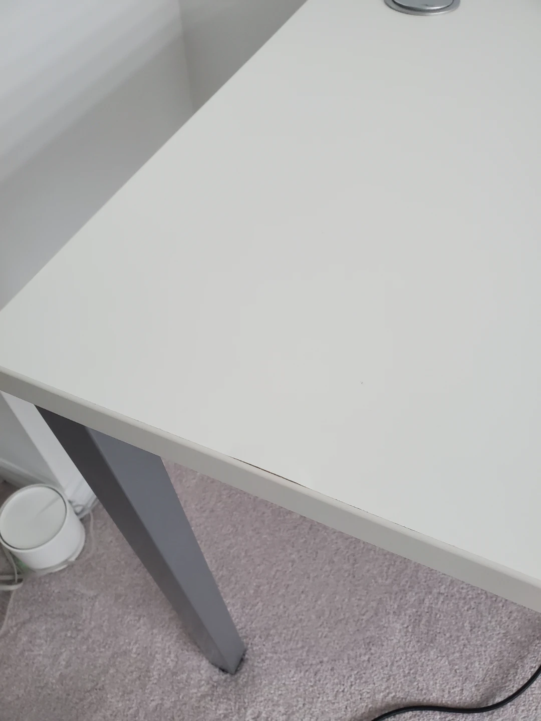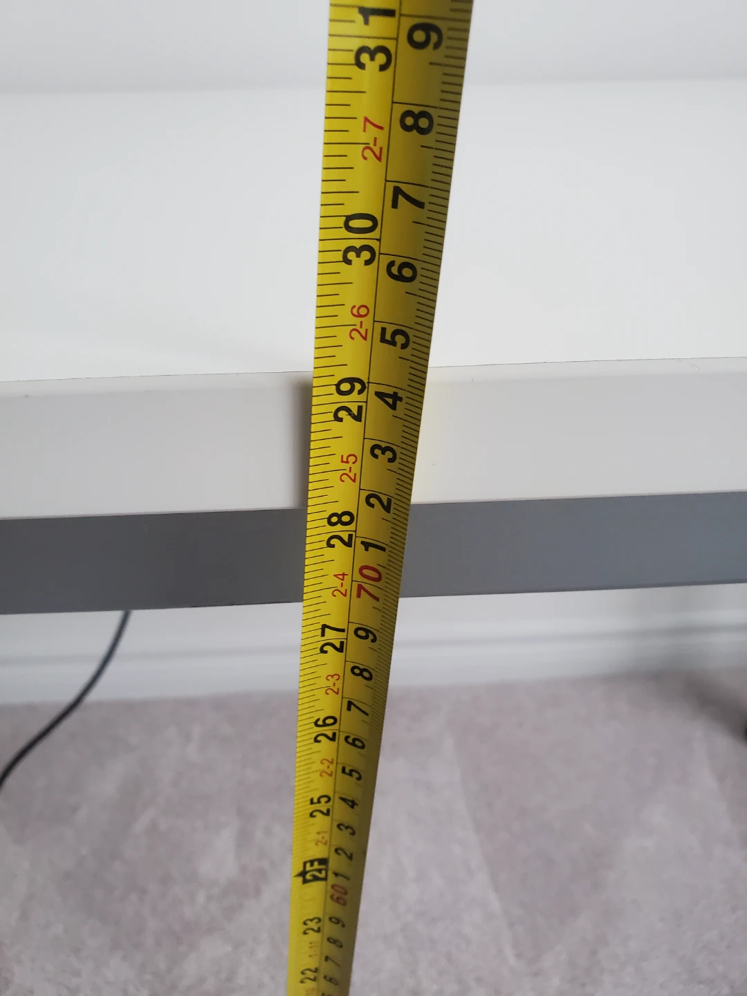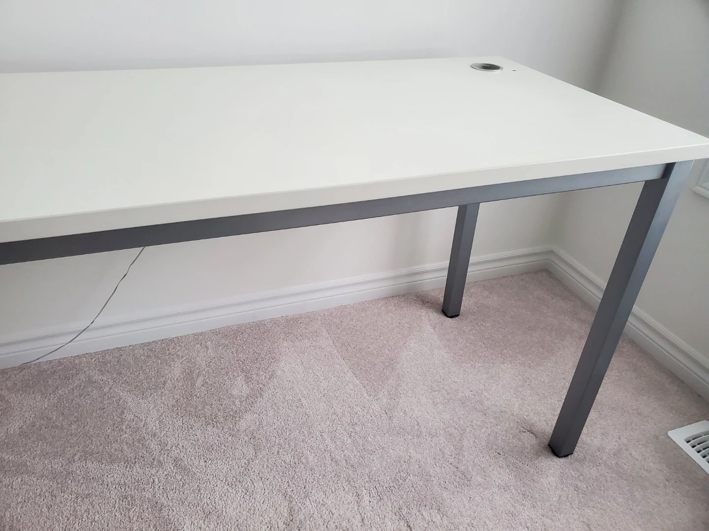 Used White desk with sturdy grey metal legs in good condition It features two grommet holes for cable management. Desk height measures approximately 29 .25 inches