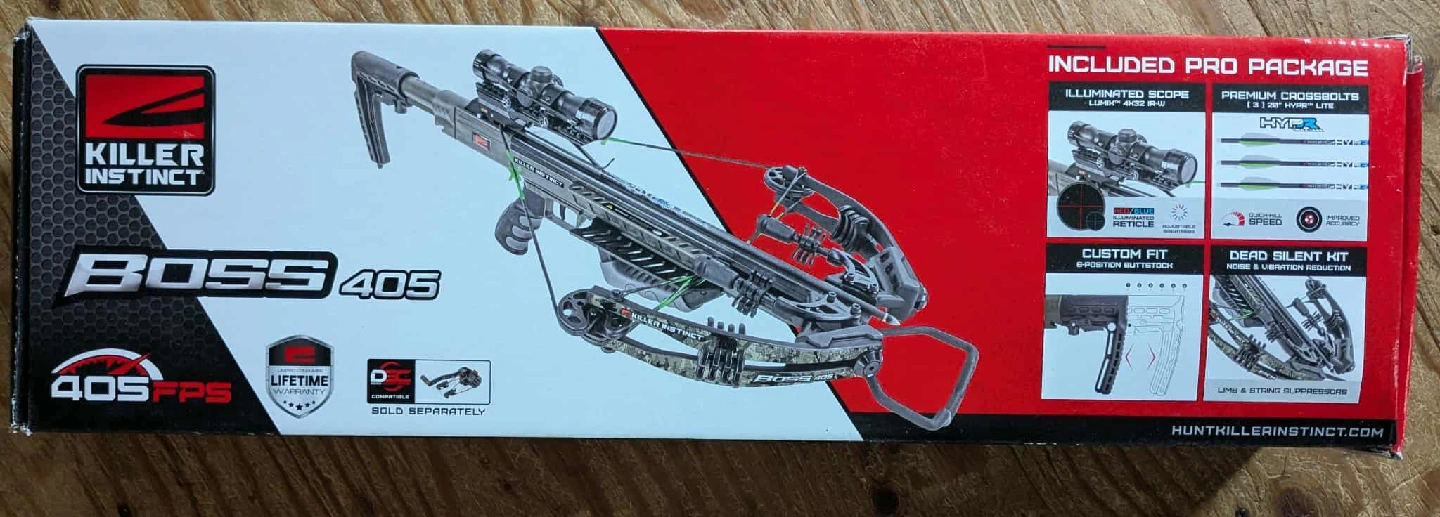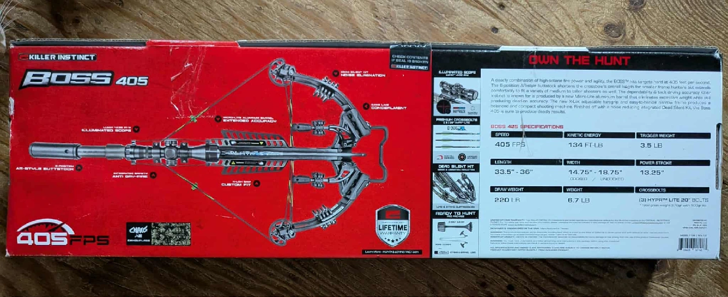 HUGE PRICE DROP $150 OFF! From $450 to $300 Must Go! Selling a Killer Instinct BOSS 405 crossbow. It comes with the original box and included pro package. Specifications include: - 405 FPS speed - 134 ft-lb kinetic energy - 3.5 lb trigger weight - 33.5"-36" length - 14.75"-18.75" width - 13.25" power stroke - 220 lb draw weight - 6.7 lb weight