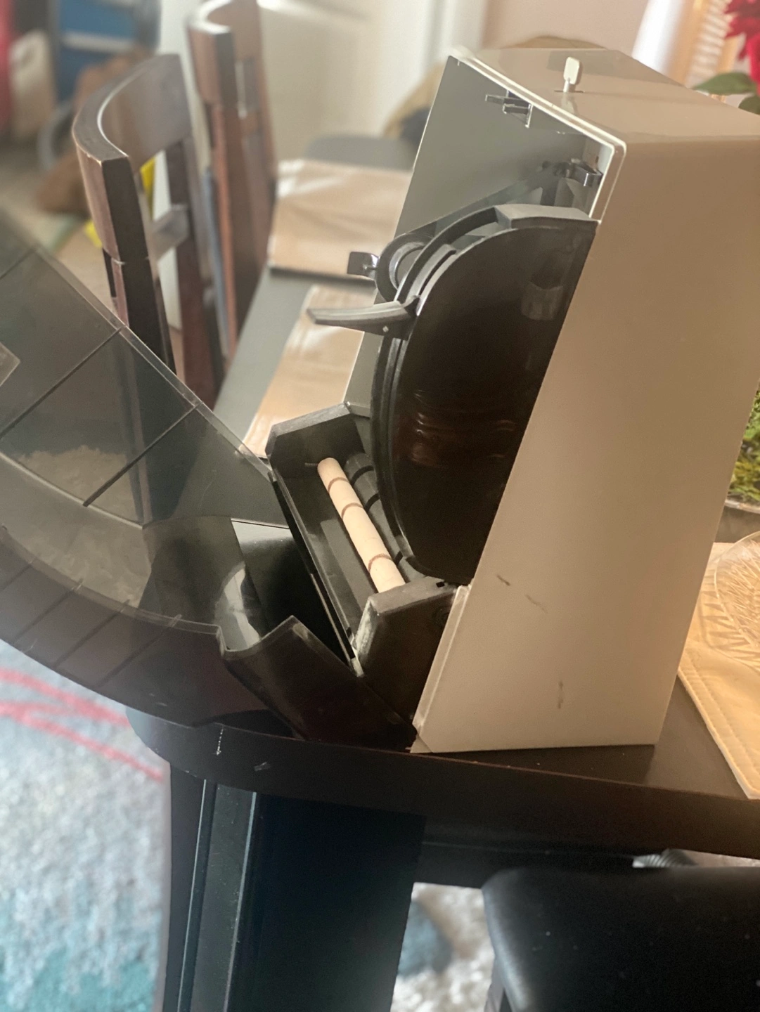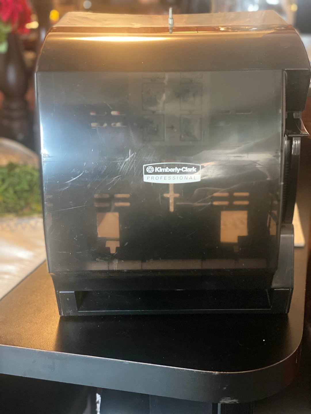 525Used Kimberly-Clark Professional paper towel dispenser. Black plastic. Some scratches and scuffs. Opens to reveal internal mechanisms. Ready for new rolls.
