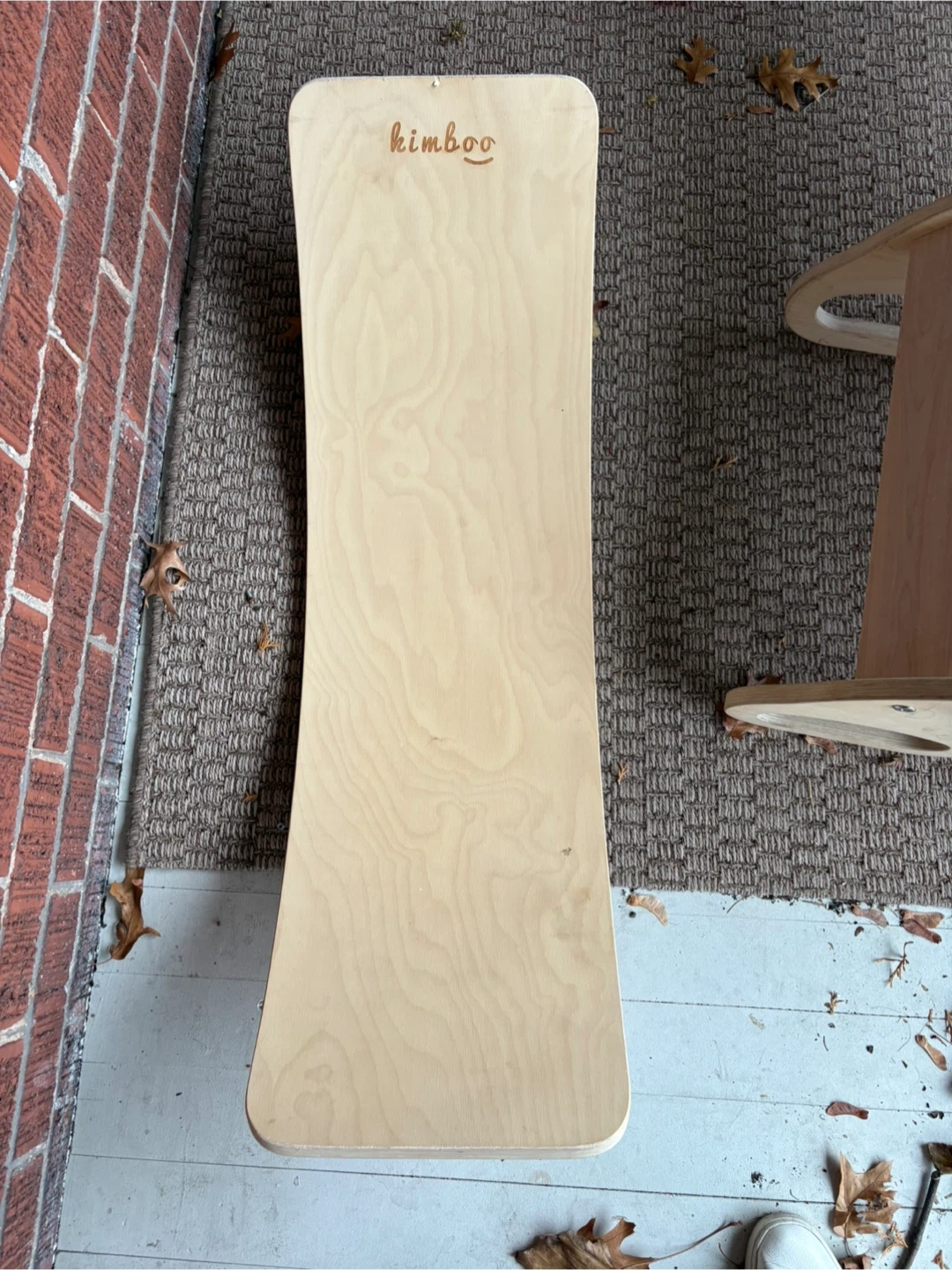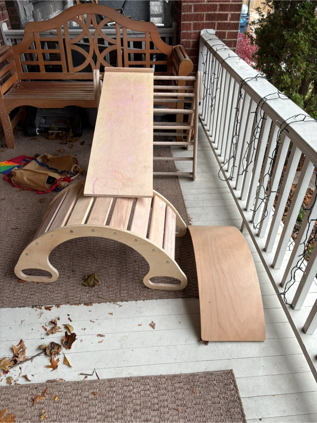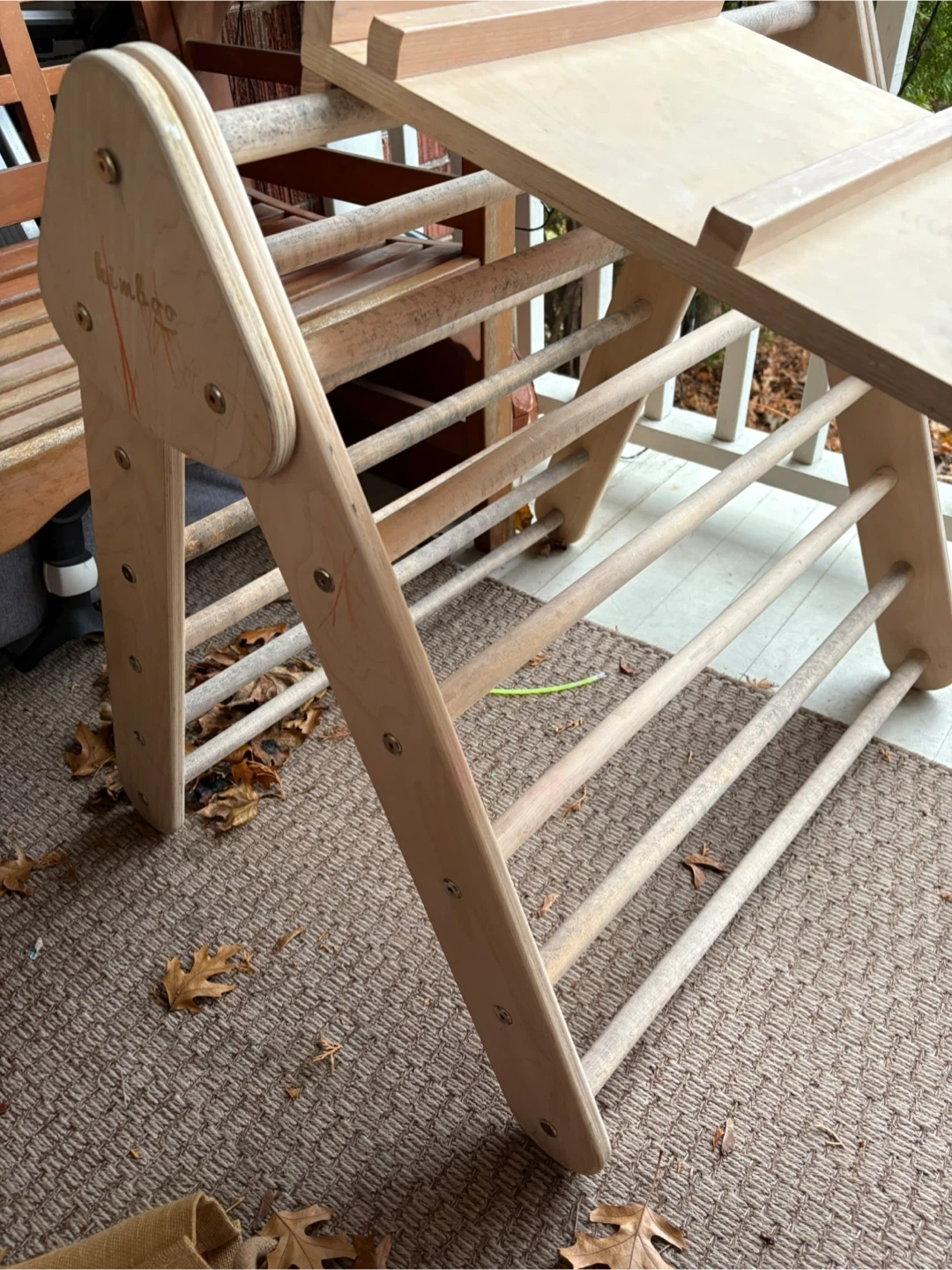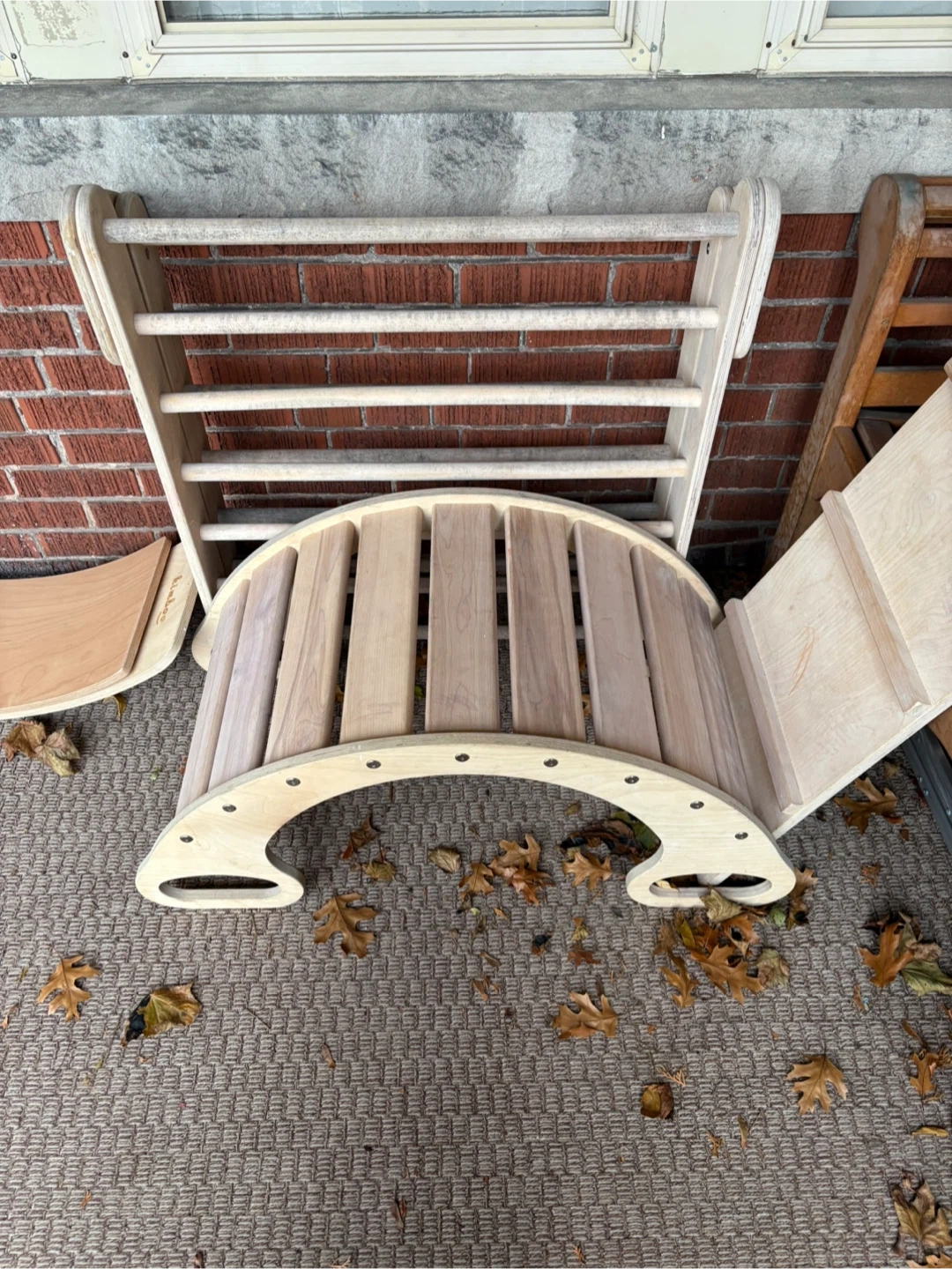 50Selling a Kimboo climbing set for kids! Includes the arch, ramp, and 2 balance boards. It's a great set to keep the little ones active and having fun. Gently used, with some minor wear. The equipment is meant to be used indoors. There’s a bit of water damage on the triangle from being left outside (see last image) but it can be sanded down easily.