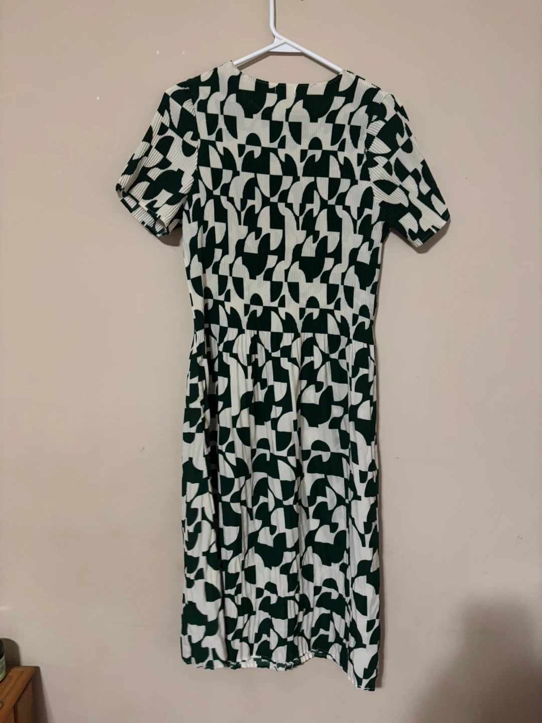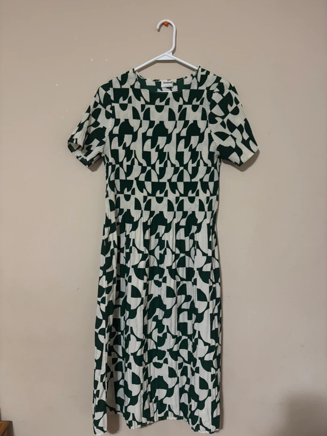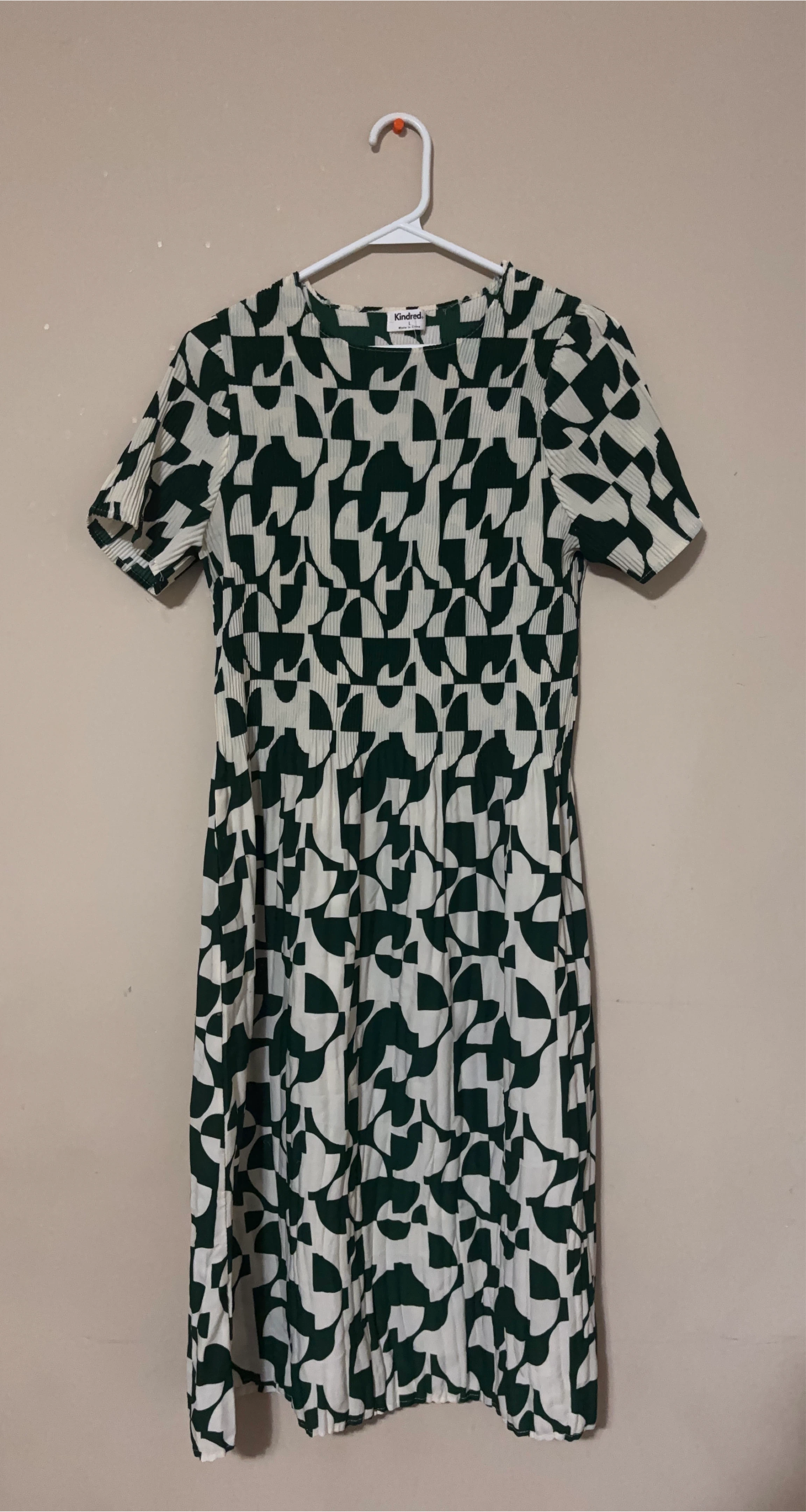 This is a cute Kindred dress with a green and white geometric pattern. It's in great condition and would be perfect for a fall day!