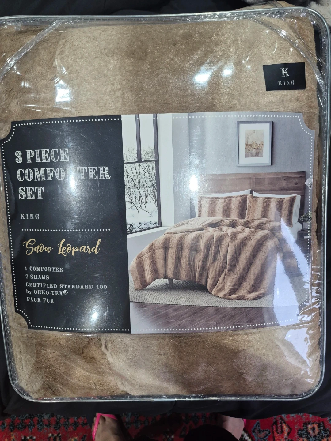 5Selling a brand new, in-package, King size 3-piece comforter set! The set includes one comforter and two shams. It's a beautiful snow leopard pattern made of faux fur. The face and reverse are 100% polyester, and it's certified Standard 100 by OEKO-TEX®