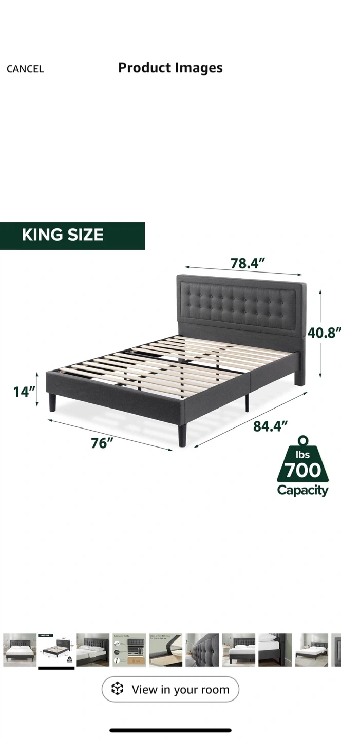 12Selling a king size bed frame in great condition! The dimensions are 78.4" x 84.4". It has a 700 lbs capacity. The headboard is 40.8" high and the frame is 14" off the ground