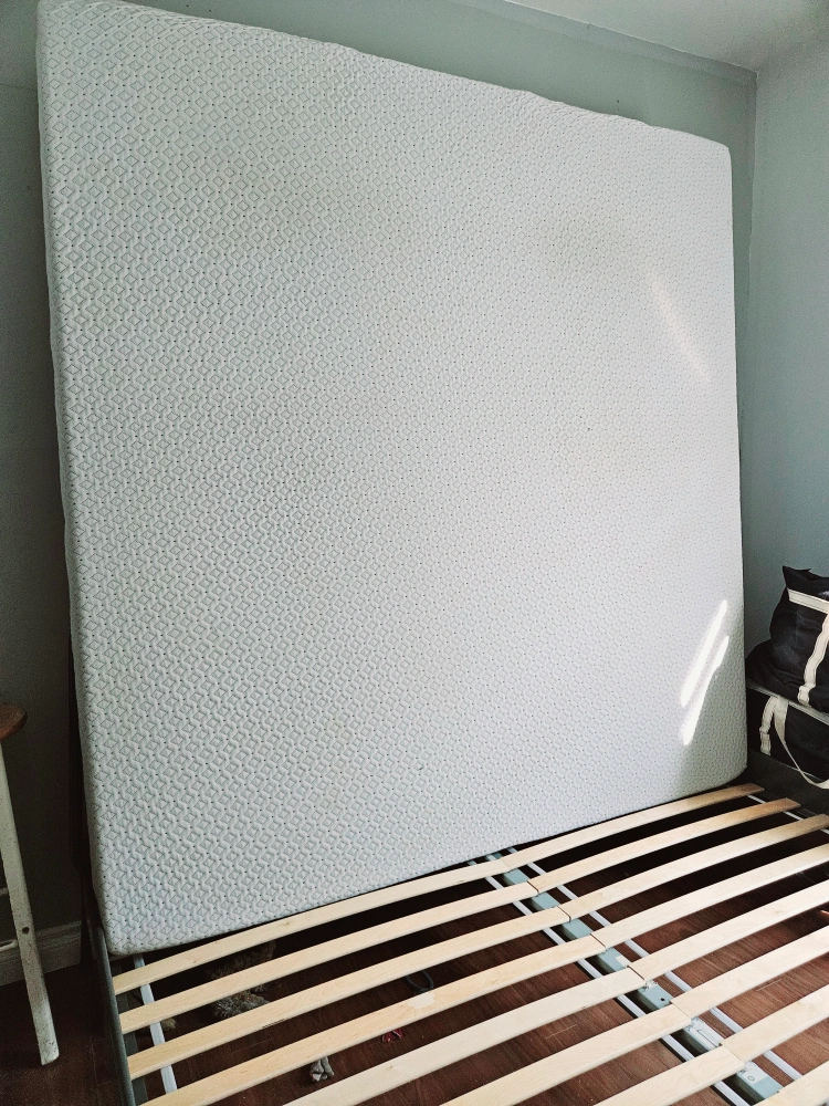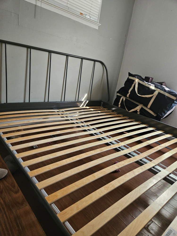 A metal bed frame in good condition. It includes a slatted base for mattress support. it's super lightweight and easy to carry around as well as assemble. I love it. I'm moving to an island so unfortunately everything must go. 80" x 76" W $250 with Endy mattress or $200 just frame.