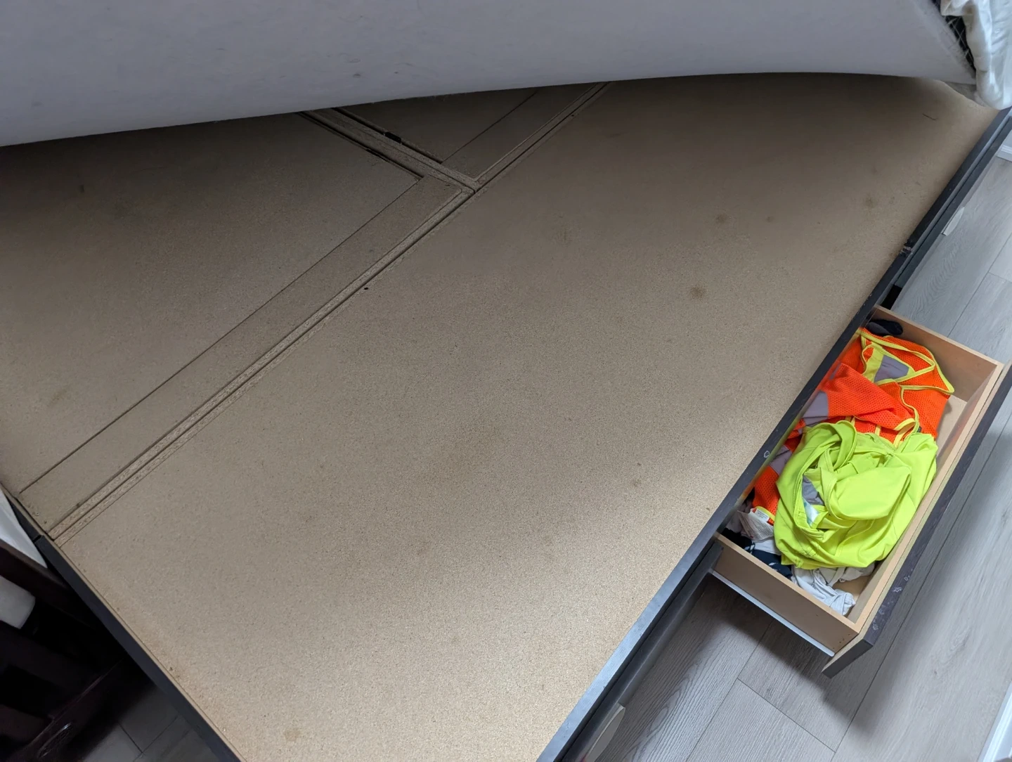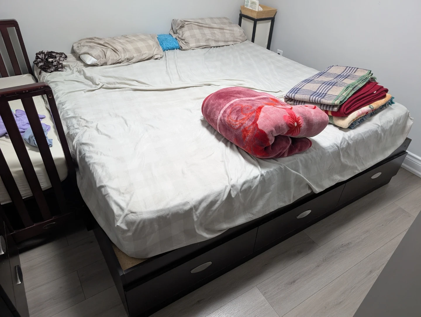 Selling a bed frame with built-in storage drawers underneath. It's great for maximizing space in smaller rooms. The frame is in good condition and the drawers slide smoothly