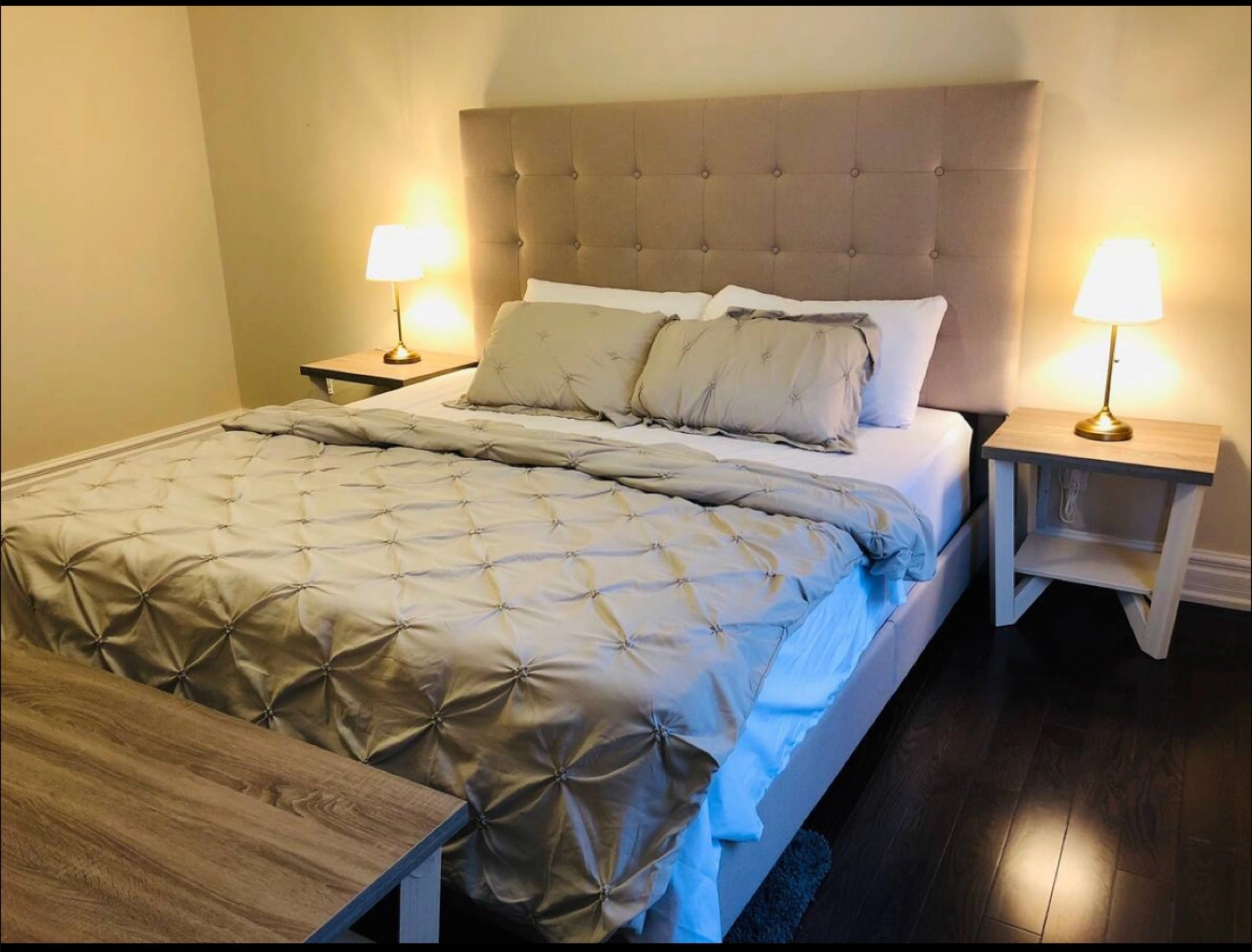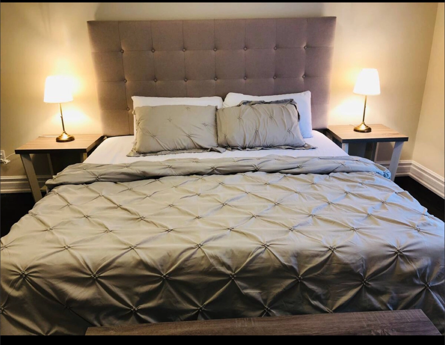 Selling a king size bed with king size mattress that's in great condition. It comes with a stylish headboard and a matching bedspread. Perfect for adding a touch of elegance to your bedroom! It comes with 2 side tables, 2 night lamps 1 coffee table