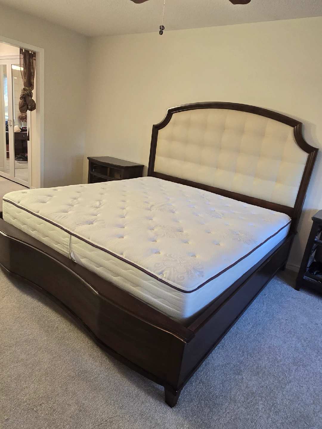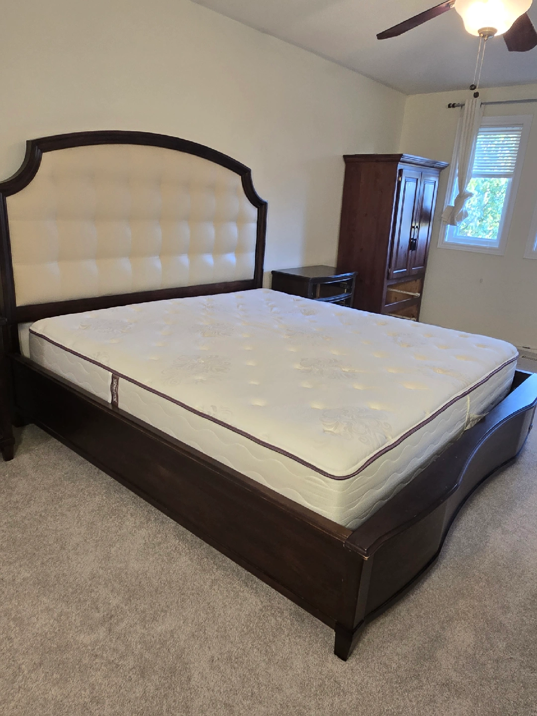 Selling a high end king size bedroom set. It comes with a stylish headboard. The bed frame features a dark wood finish and an elegant design. The headboard is upholstered with cream-coloured, tufted leather. Dresser with 9 drawers and mirror. Bedside tables 2 with 3 drawers each. Perfect for adding a touch of sophistication to your bedroom! Bought from Decorium Furniture. Solid wood. Great quality. Excellent deal.