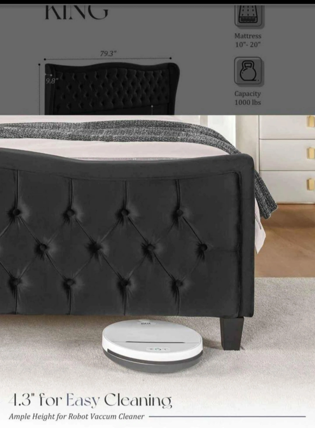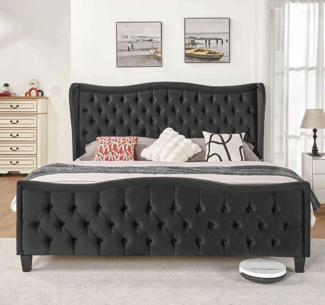 74Elegant king size bed frame. Black velvet upholstery. Features button tufting and wingback headboard. 52.9" headboard height. Supports 1000 lbs. Ample clearance for robot vacuum.no spring box required, brand new in box