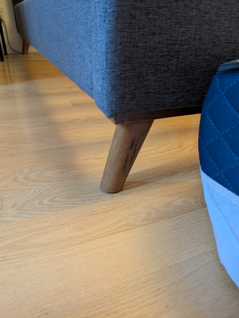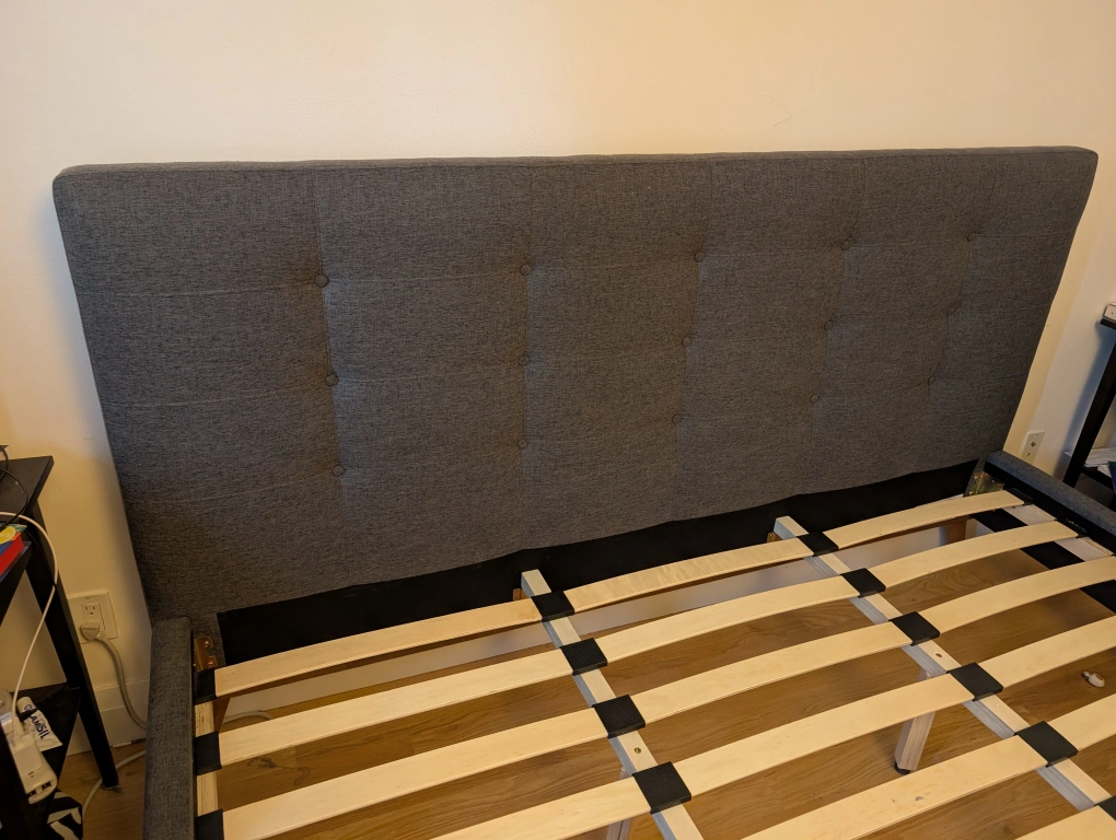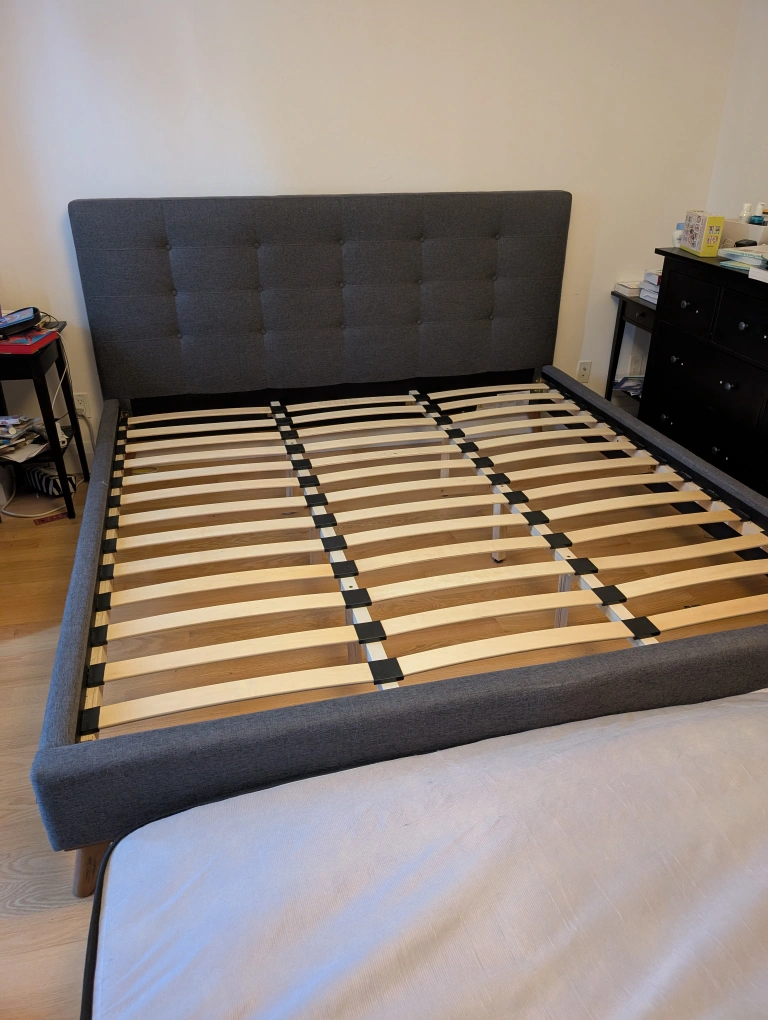 36Selling a king size bed frame with a grey upholstered headboard and side rails. The bed has a modern, minimalist design with wooden legs. Purchased from Wayfair for $800+HST 4 years ago.