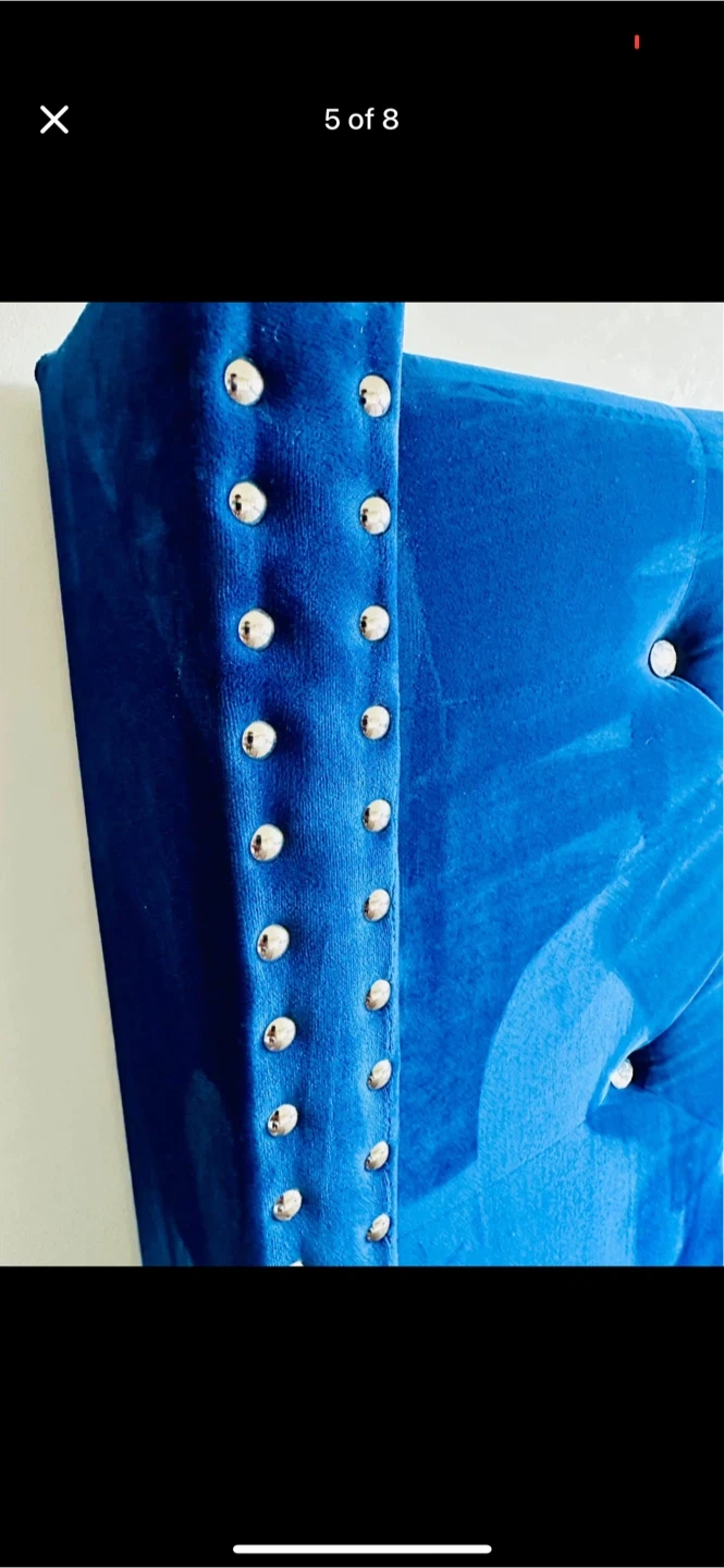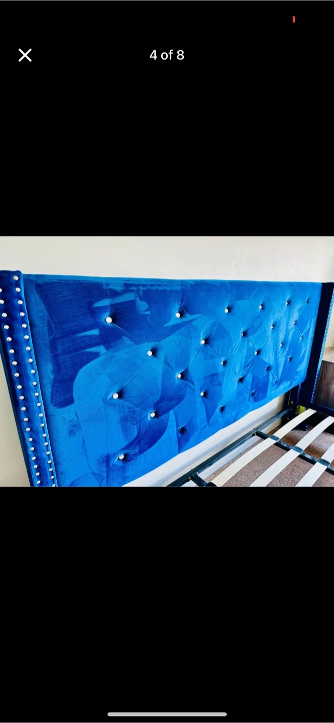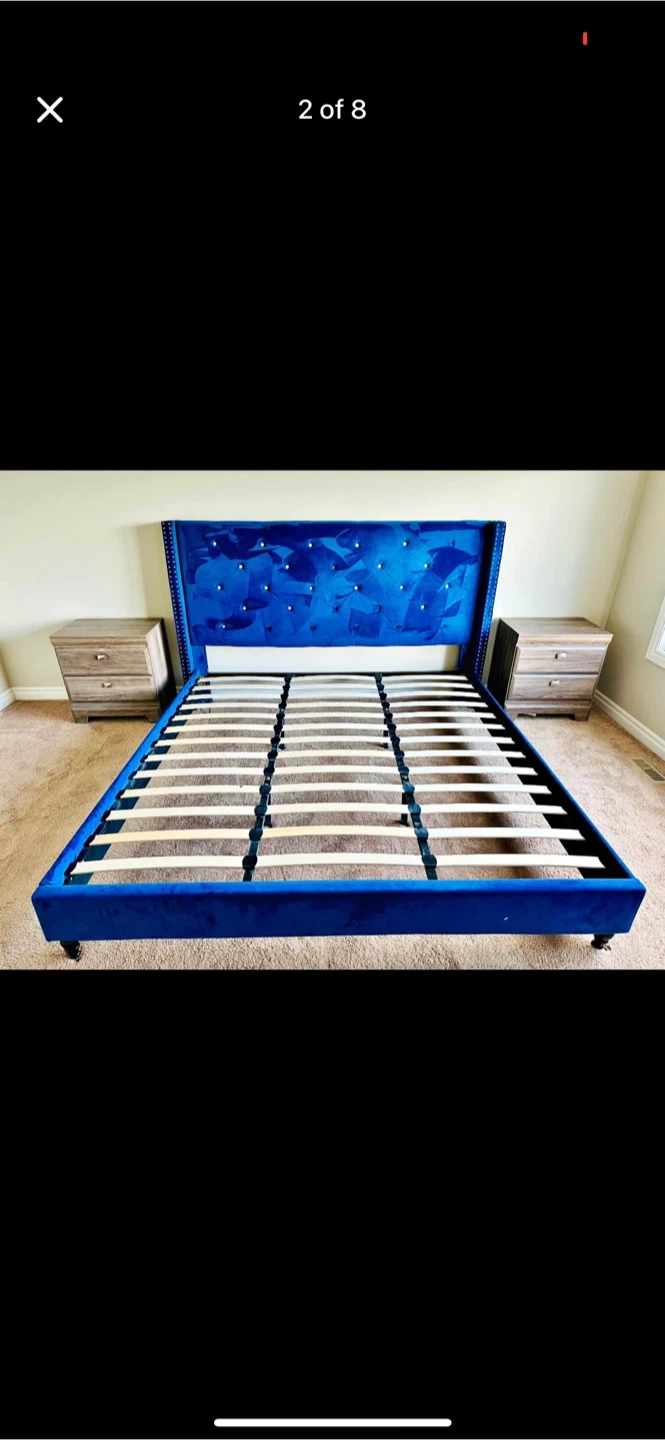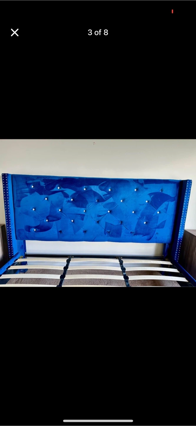 20Selling a beautiful blue velvet bed frame with two side ! It features a tufted headboard with crystal-like accents. The bed frame is in great shape and would add a touch of elegance to any bedroom