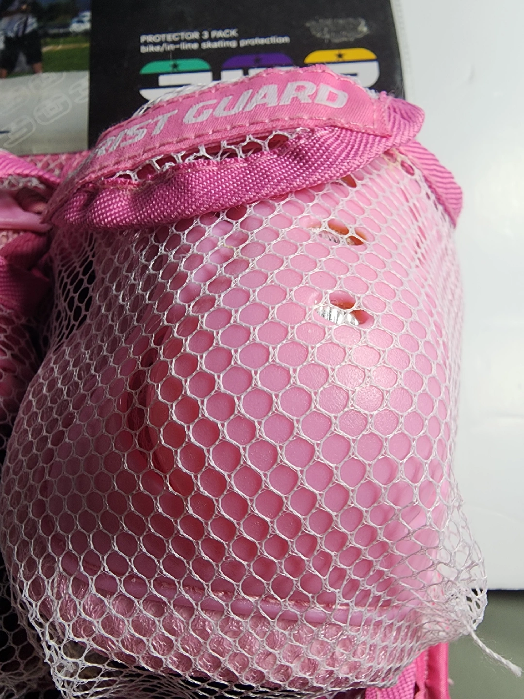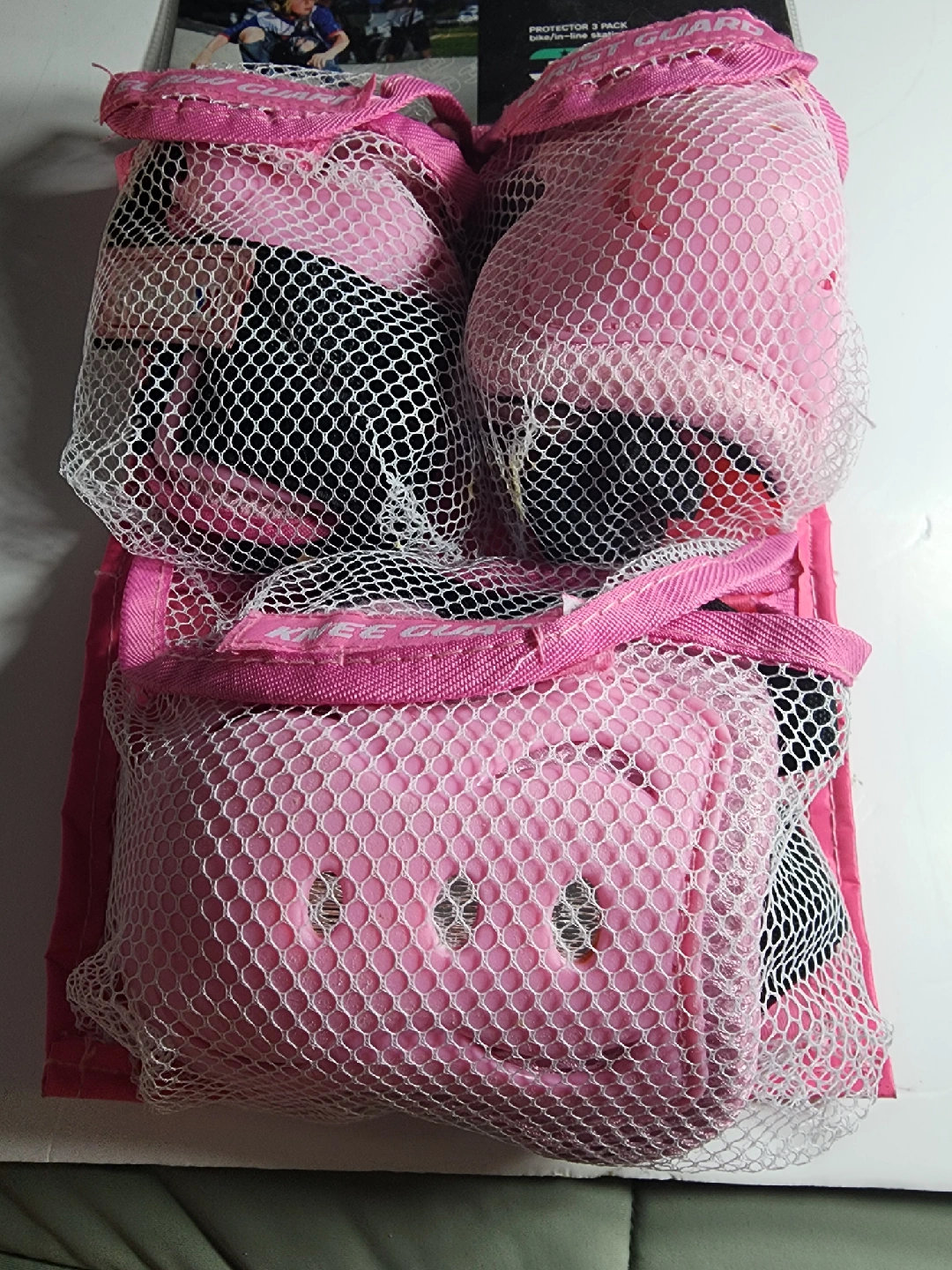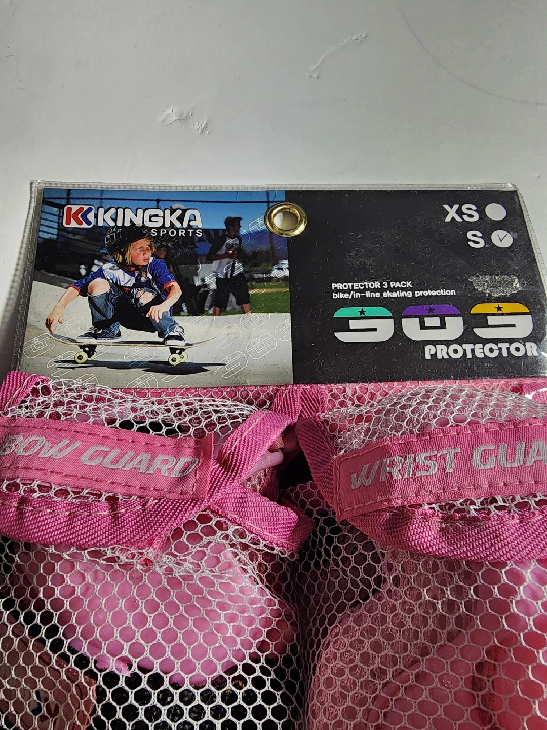 KINGKA Sports Protective 3 Pack for bike/in-line skating protection in size XS. This set includes wrist guards, elbow pads, and knee pads, all designed for comfort and safety. They feature an anatomical bottom splint, internal top splint, and air vent system. The pads are washable for easy cleaning