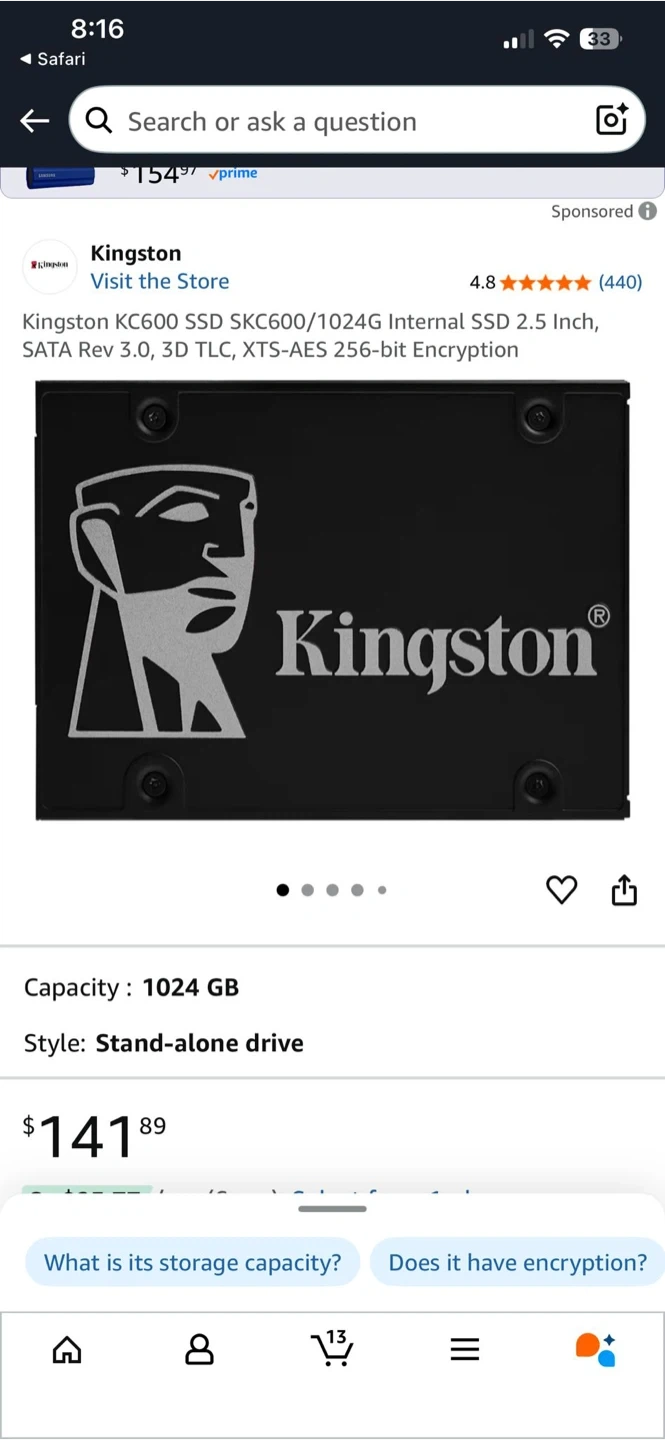 99Selling a brand new Kingston KC600 1TB SSD! Never been used and still in its original packaging. - Solid-state drive - 15x faster than a standard hard drive - SATA Rev 3.0 (6Gb/s) - Originally bought for $141.89