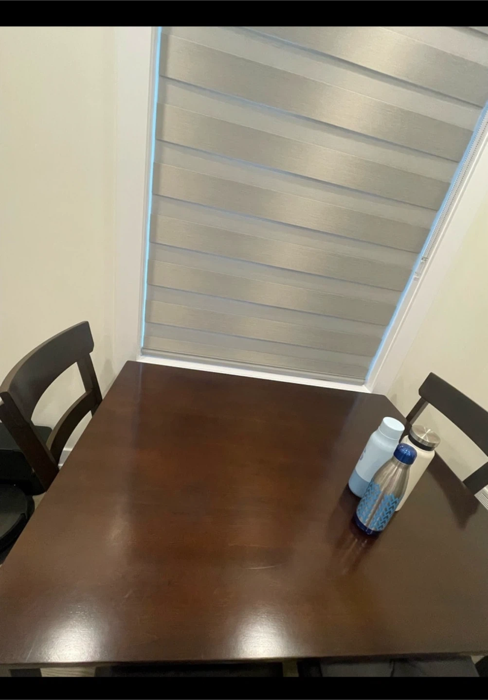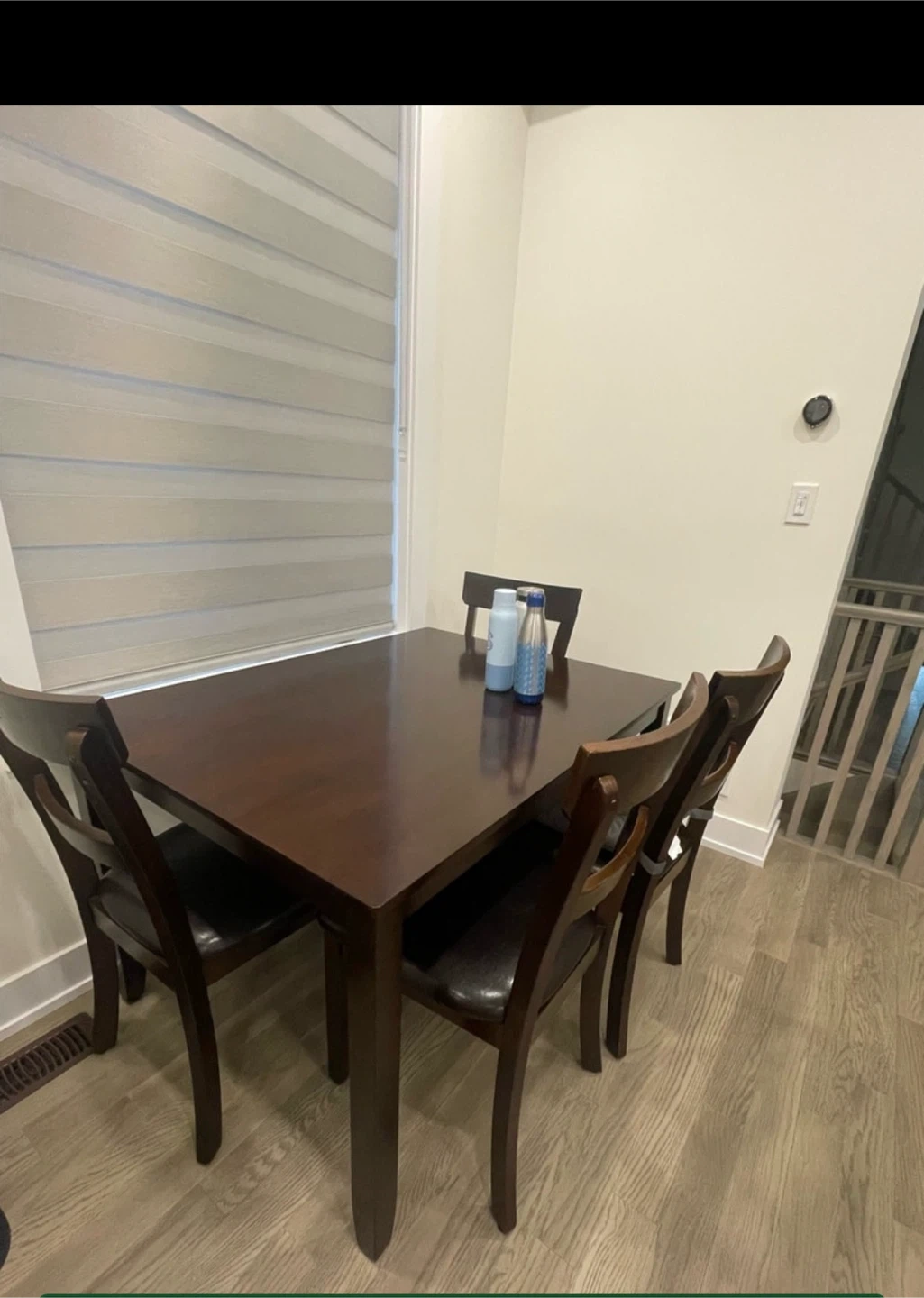 A dark wood dining table and four matching chairs. The table has a smooth, finished top and sturdy legs. The chairs feature upholstered seats for comfort. This set's compact size is suitable for smaller dining areas.