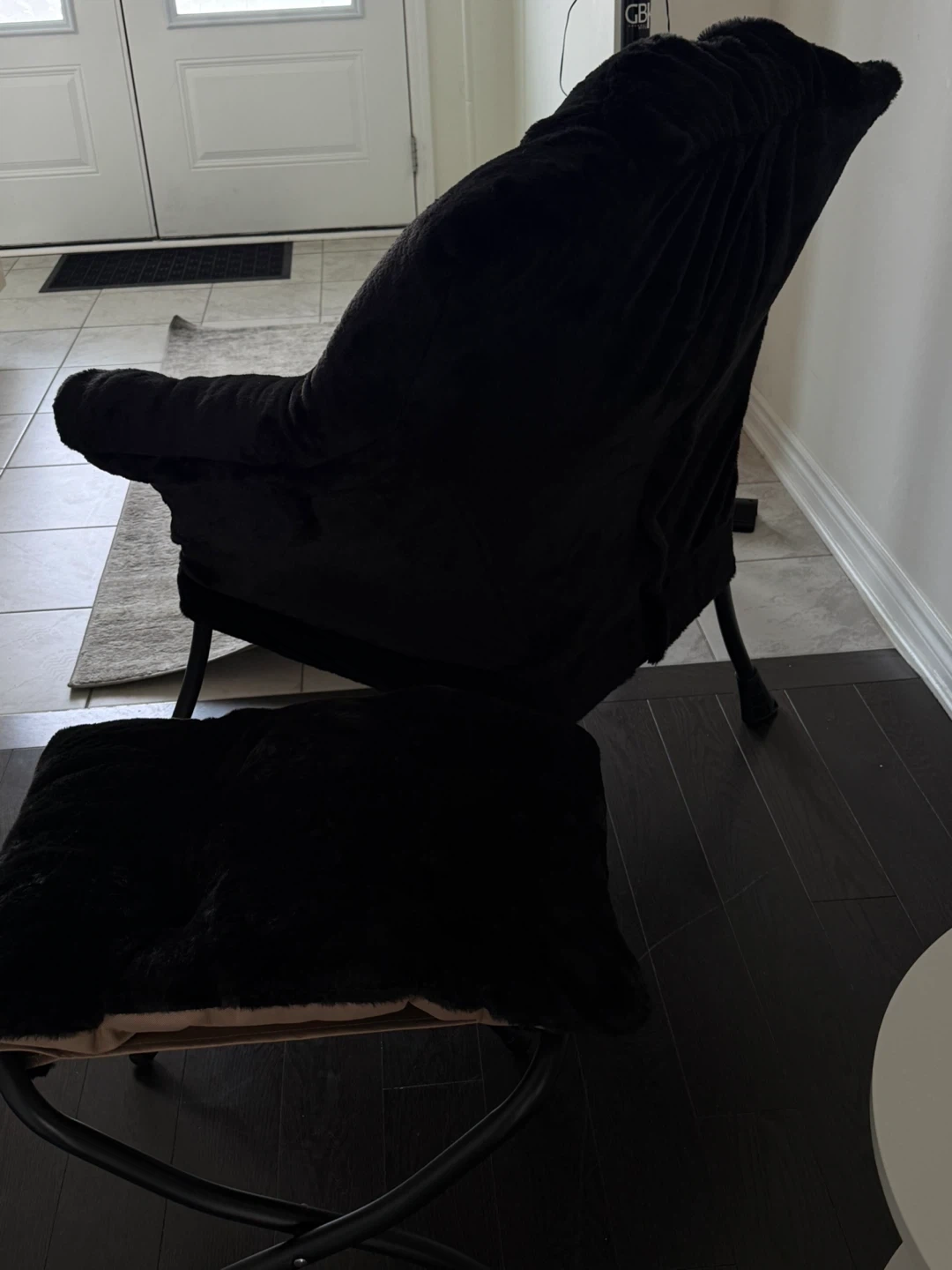 Super cozy black faux fur lounge chair with a matching ottoman. It's incredibly soft and plush, perfect for relaxing. The chair has a sturdy metal frame and a removable headrest pillow. Its dimensions are approximately 30"W x 30"D x 35"H. This chair is great for reading or lounging!