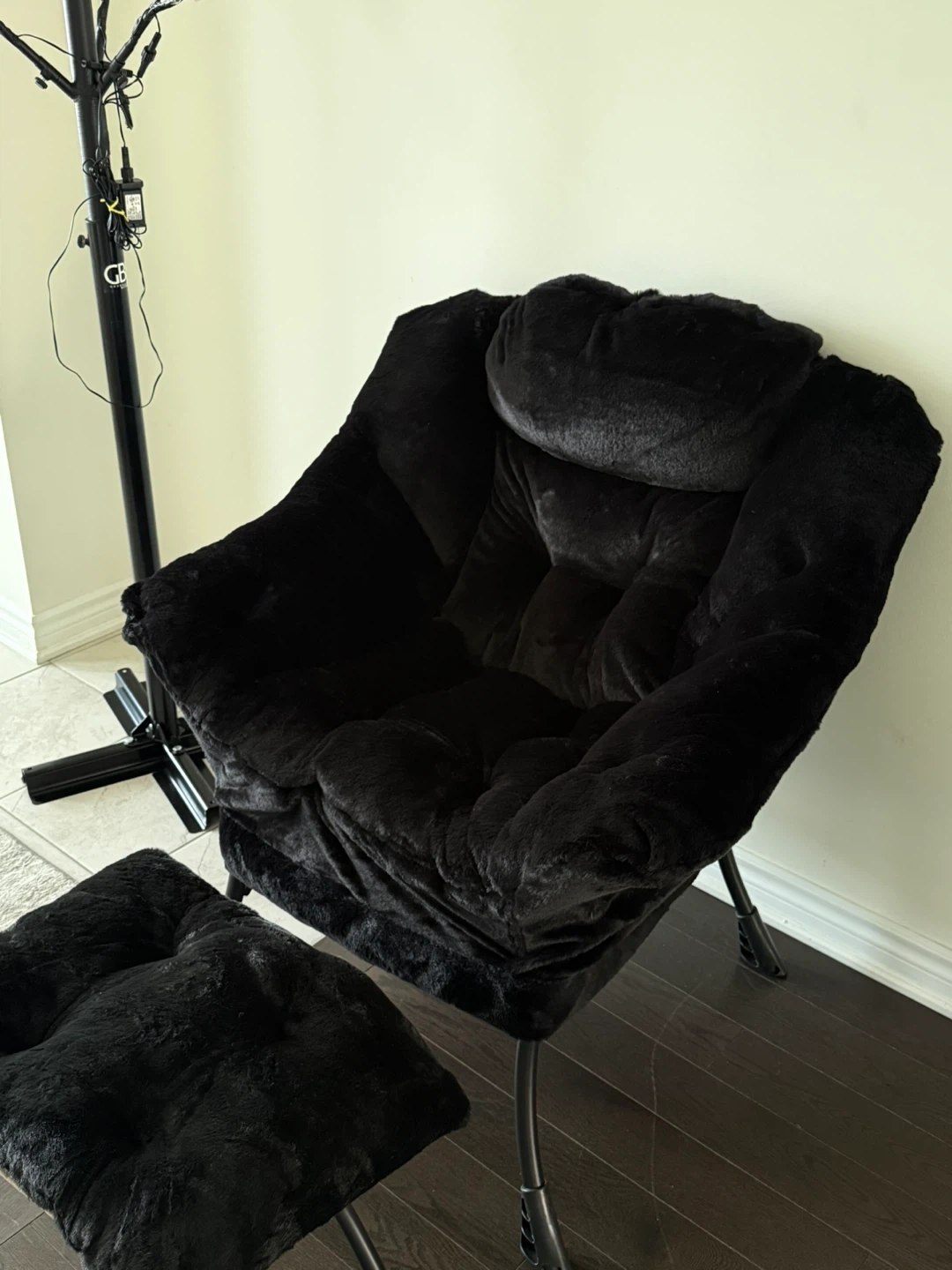 Super cozy black faux fur lounge chair with a matching ottoman. It's incredibly soft and plush, perfect for relaxing. The chair has a sturdy metal frame and a removable headrest pillow. Its dimensions are approximately 30"W x 30"D x 35"H. This chair is great for reading or lounging!
