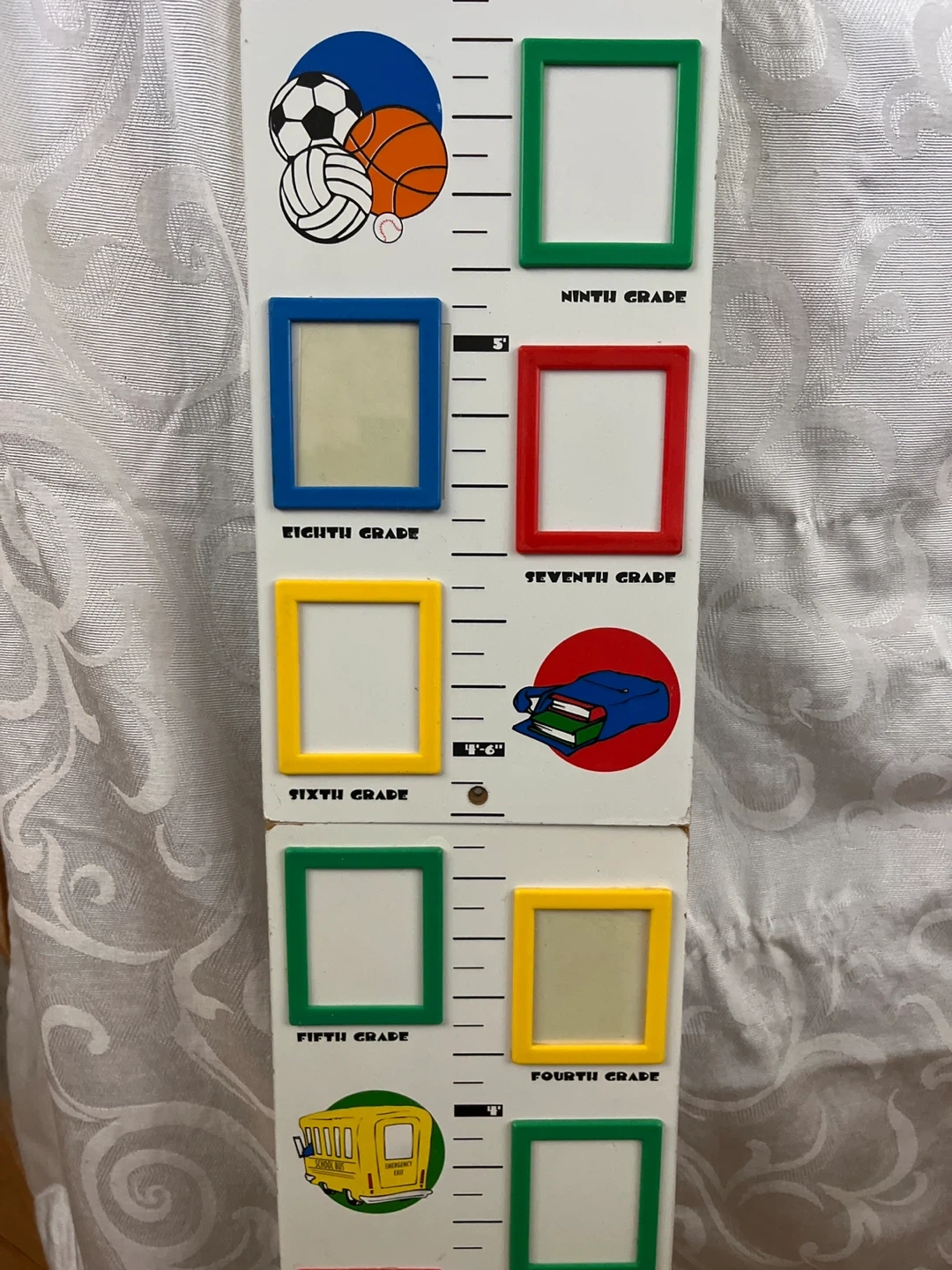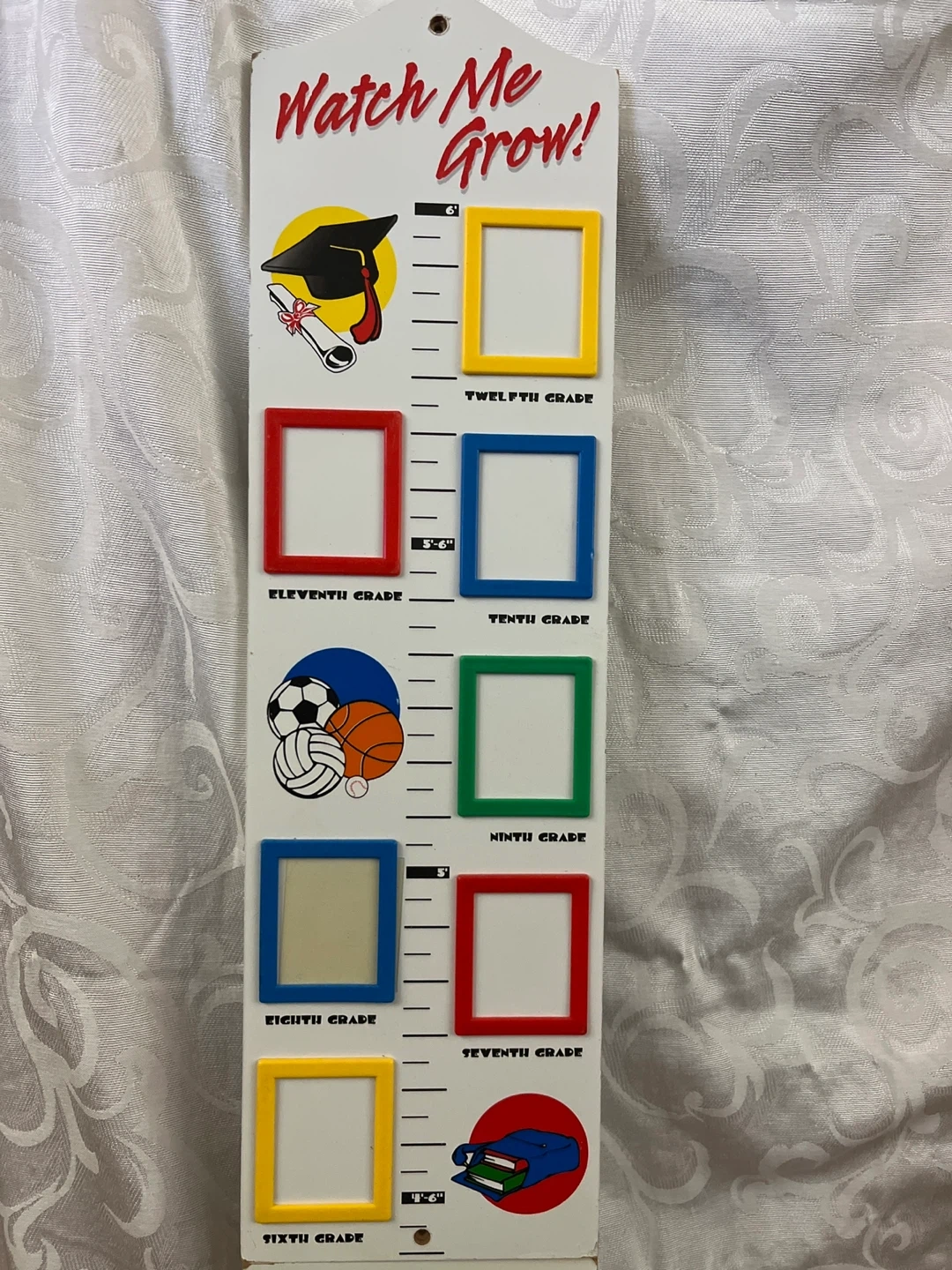 This "Watch Me Grow!" height chart is a fun way to track a child's growth. It includes multiple colourful photo frames, each labelled with a grade level from Kindergarten to Twelfth Grade. It's a sweet keepsake to document their school years!
