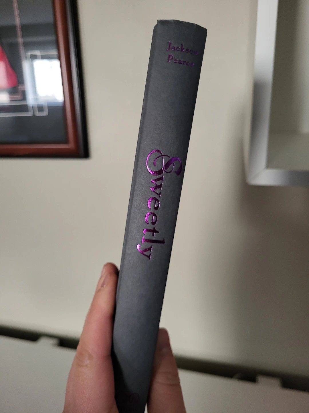 This is the book "Sweetly" by Jackson Pearcy. It features a striking purple endpaper and a dark grey cover with metallic lettering. A unique addition for any book collector!