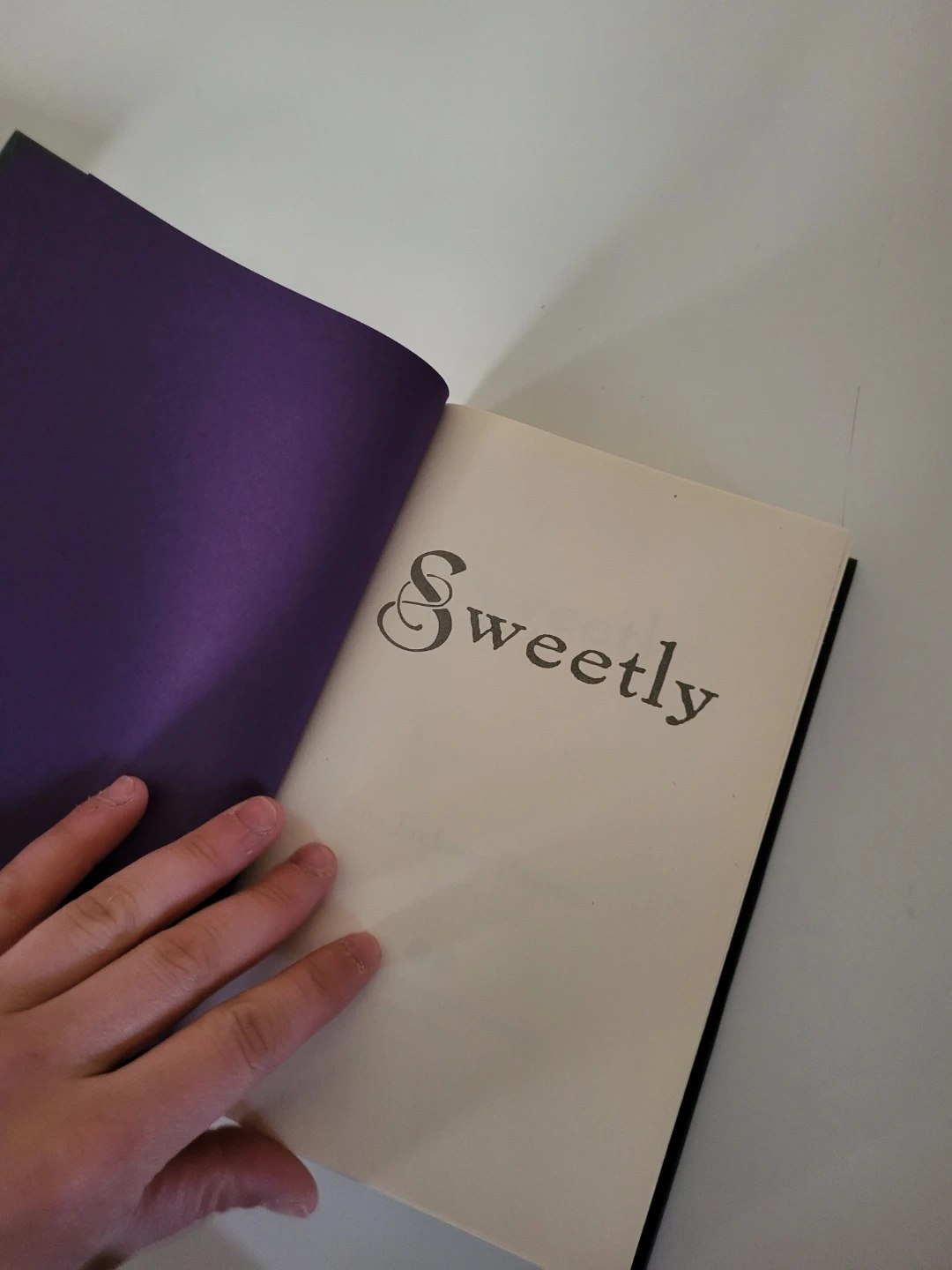 This is the book "Sweetly" by Jackson Pearcy. It features a striking purple endpaper and a dark grey cover with metallic lettering. A unique addition for any book collector!
