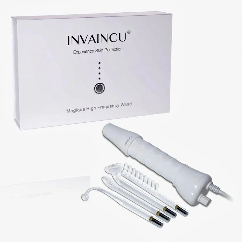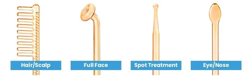 Multi-functional high frequency wand used for reducing acne, stimulating circulation, and improving skin tone. Includes multiple glass electrode attachments. Helps with fine lines, hair regrowth, and blemishes.