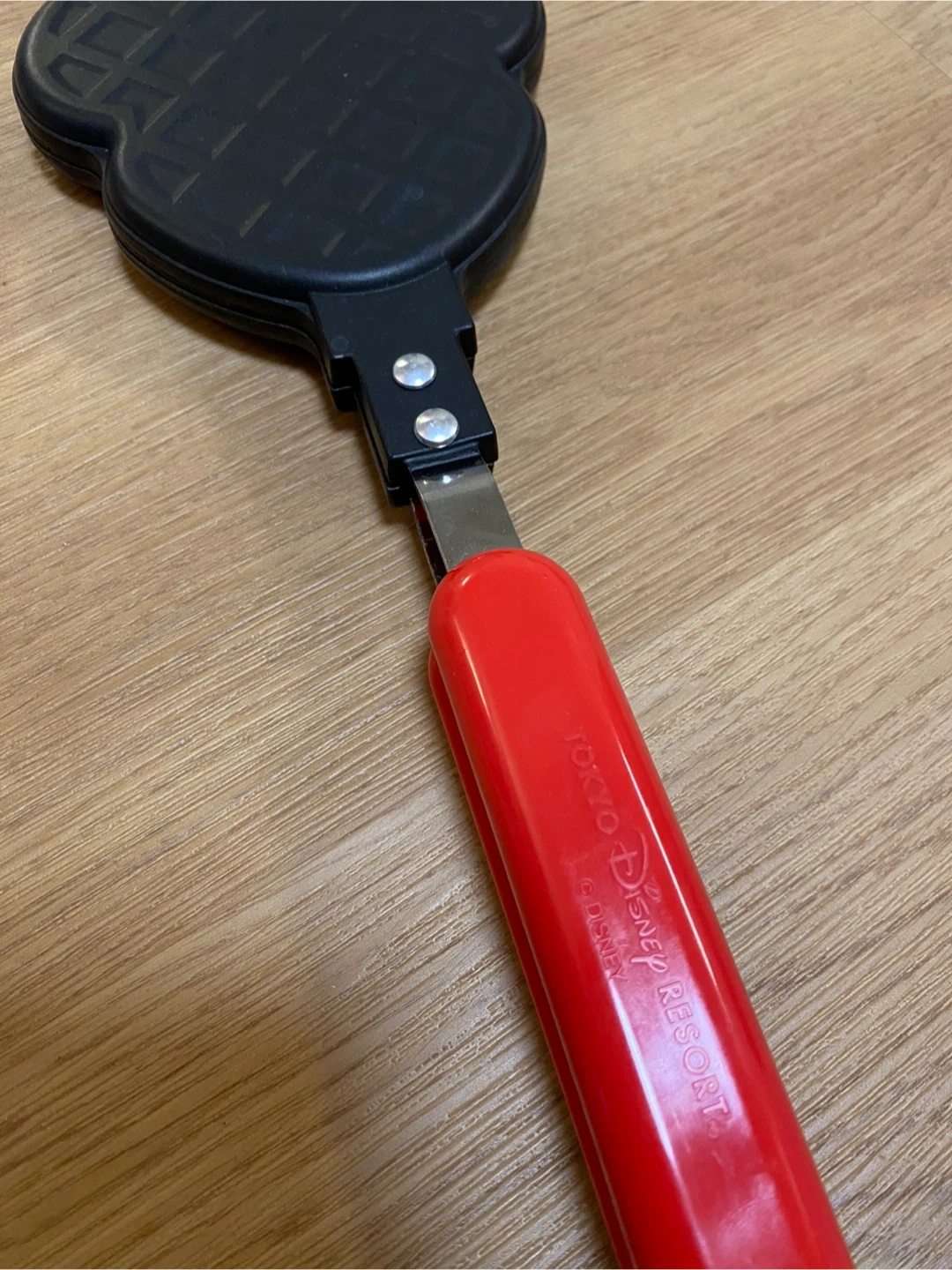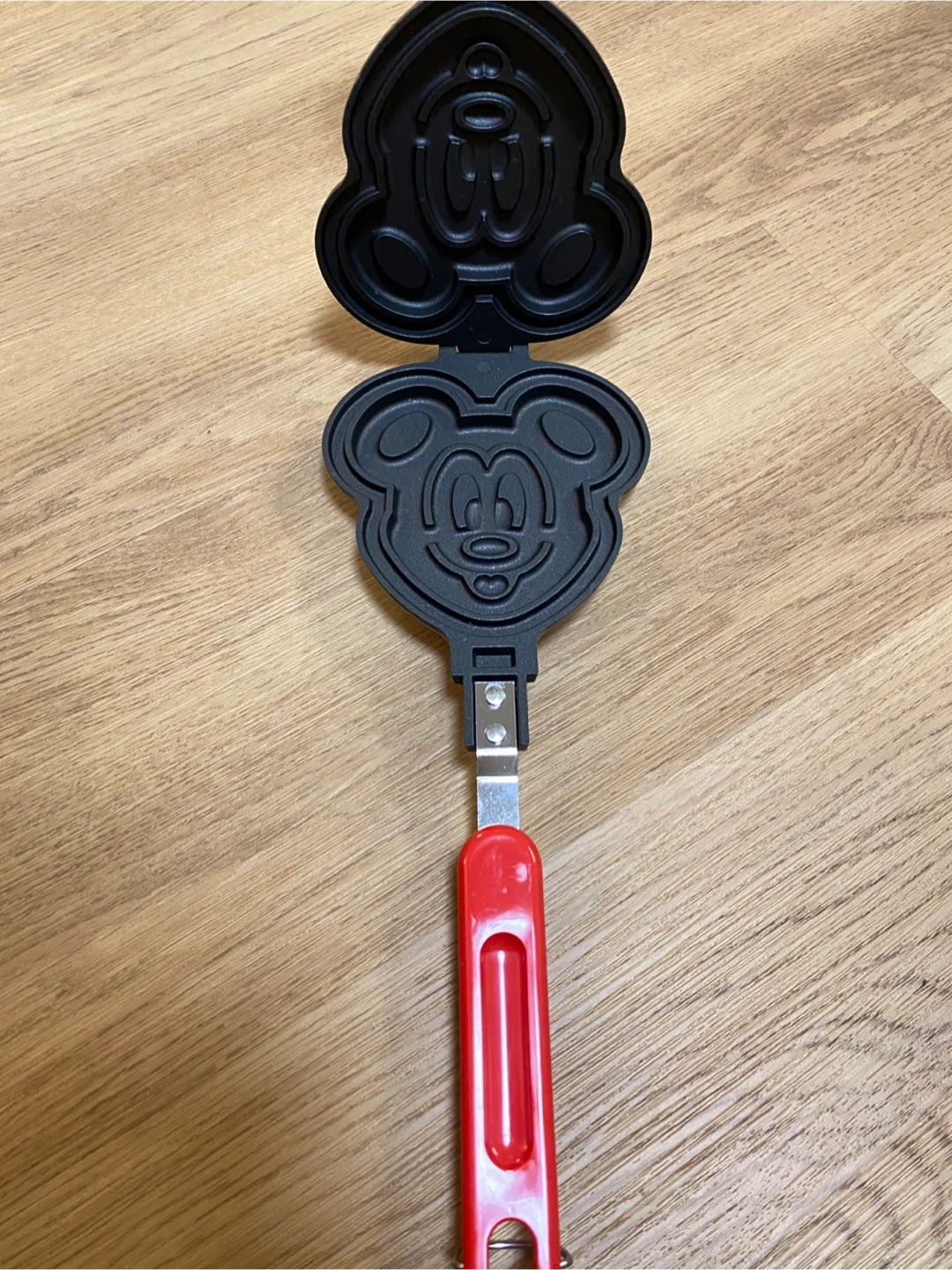 This is a Disney Mickey Mouse waffle maker. It has red handles and non-stick cooking plates. It's great for making fun breakfast treats!