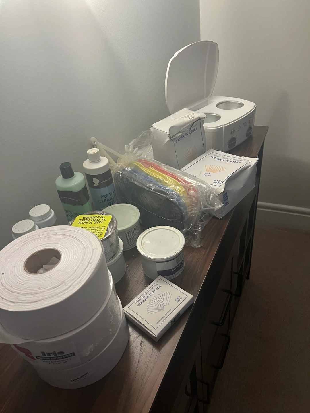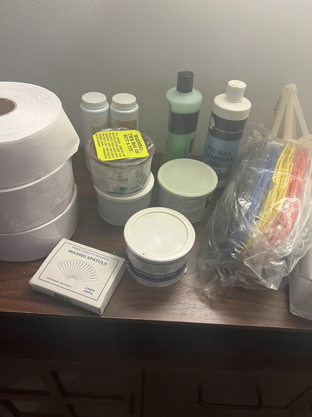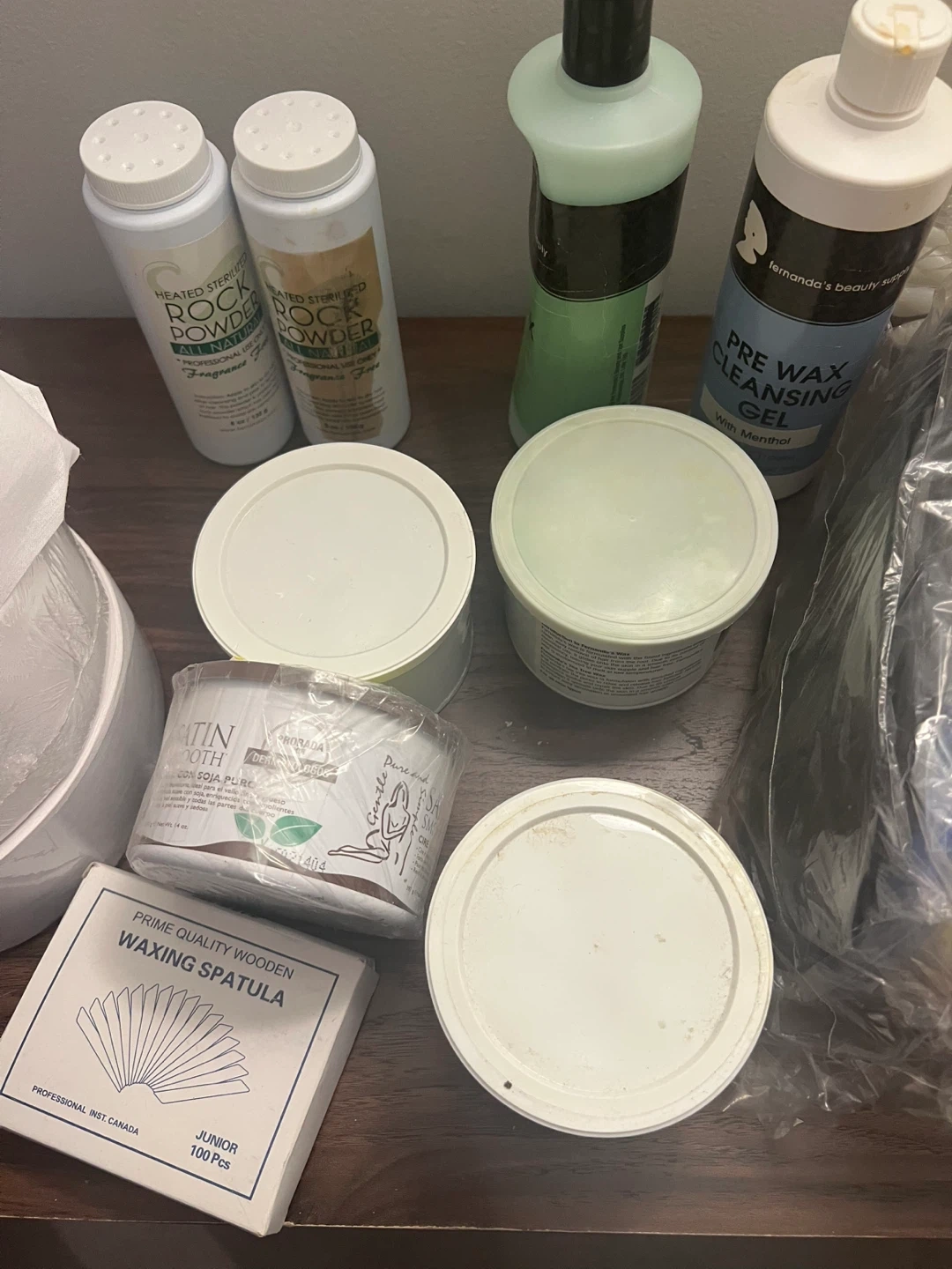 Selling a collection of salon waxing supplies! Includes a wax warmer, pre-wax cleansing gel, various waxes, wooden spatulas, and more. Perfect for anyone looking to stock up on essentials for waxing services
