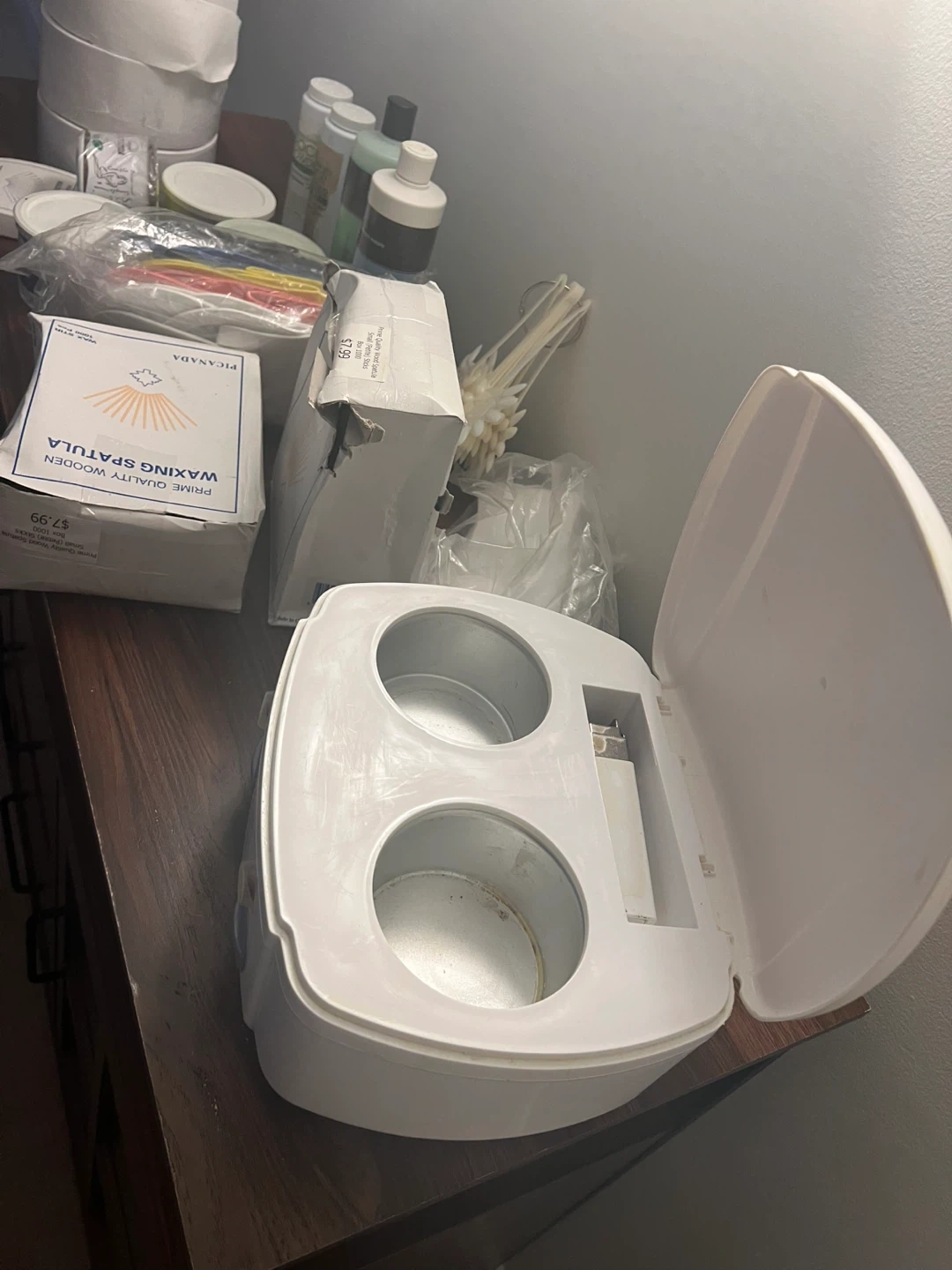 Selling a collection of salon waxing supplies! Includes a wax warmer, pre-wax cleansing gel, various waxes, wooden spatulas, and more. Perfect for anyone looking to stock up on essentials for waxing services