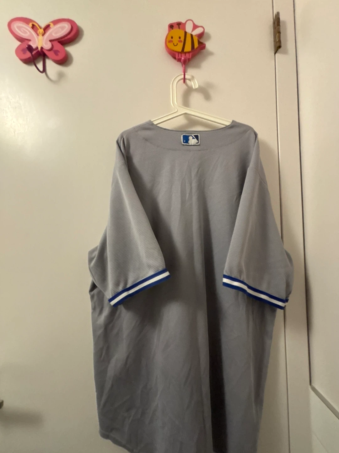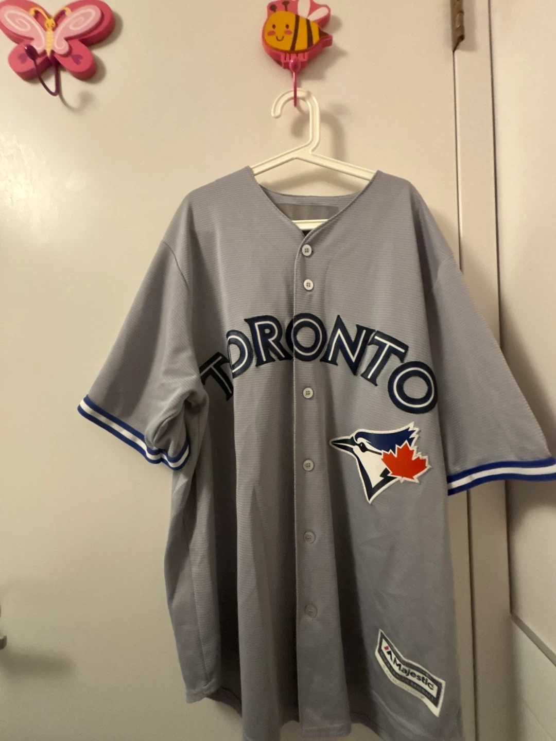 Majestic MLB Cool Base jersey for the Toronto Blue Jays. It's grey with blue trim and features the Toronto text across the chest with a Blue Jays logo. Made with Cool Base technology.