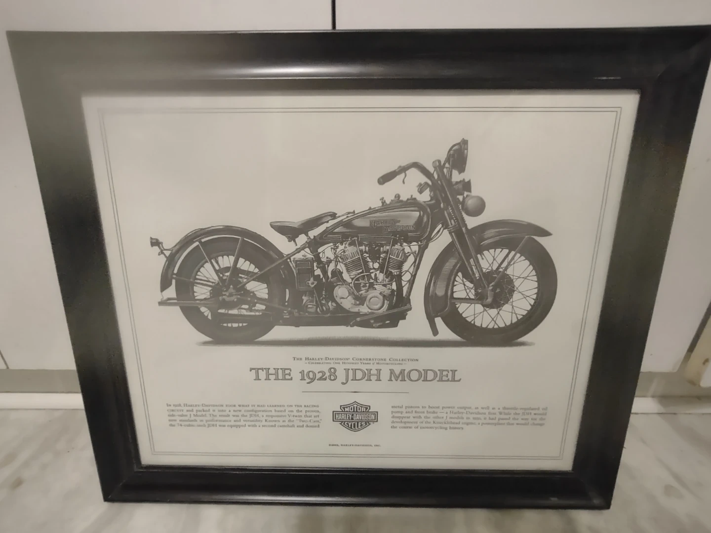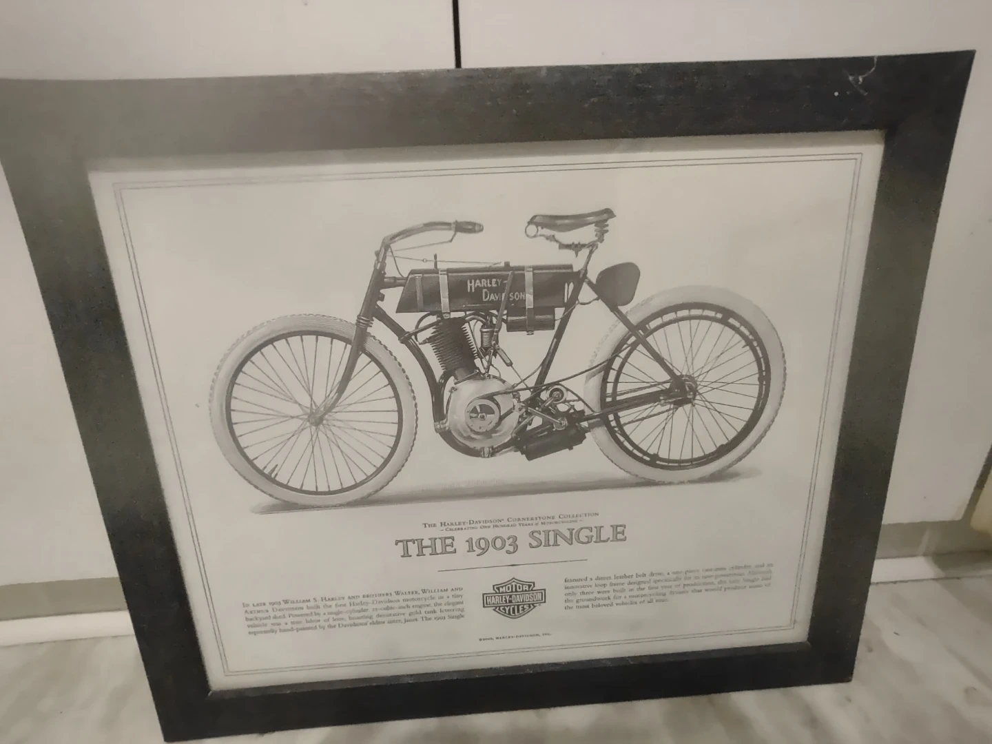 This framed print showcases the "The 1903 Single" model from Harley-Davidson. It's part of the Cornerstone Collection, featuring an image and text detailing the motorcycle's history. Perfect for any motorcycle enthusiast or collector!