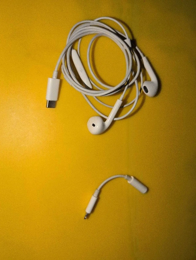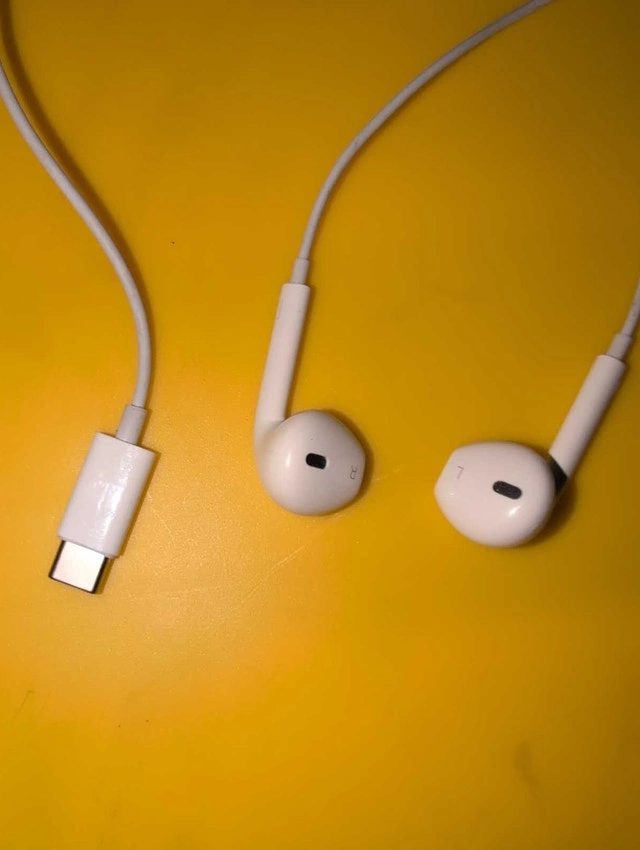 Get ready to immerse yourself in sound with these Apple EarPods! These used earbuds deliver crisp audio quality, making your favourite tunes sound better than ever. Note that these EarPods come with a USB-C connector. Also included is the headphone jack adapter, so you can use them with any device. Own a piece of Apple's iconic audio technology. If the ad is up, these EarPods are still available, so grab them before they're gone! Cash accepted.