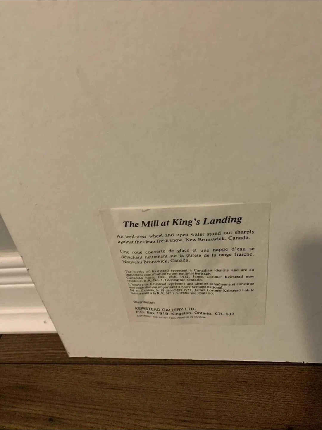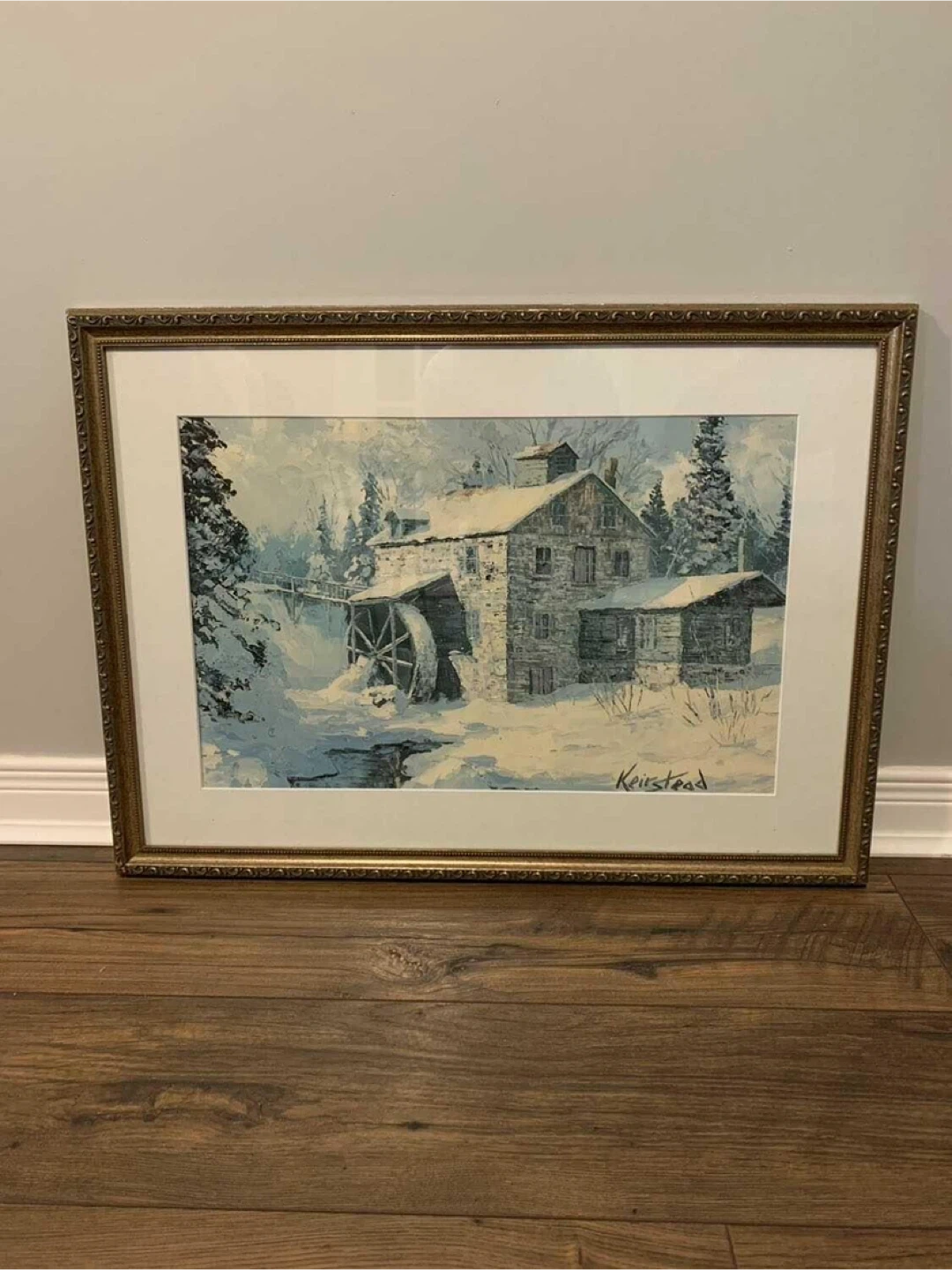 67Selling a lovely framed print by Kirstead, titled 'The Mill at King's Landing'. It depicts a charming winter scene with a mill covered in snow. This piece would add a touch of Canadian heritage to any room!