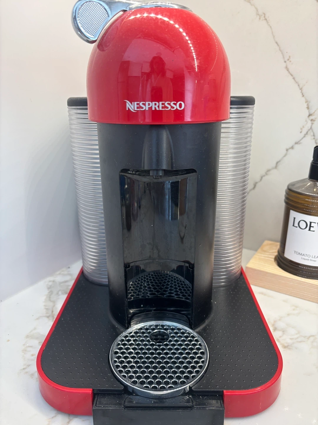 Make delicious coffee and espresso drinks with this Nespresso VertuoPlus machine. It's a sleek red and black model. In new condition, works perfectly. I can also give you some pods with the machine.