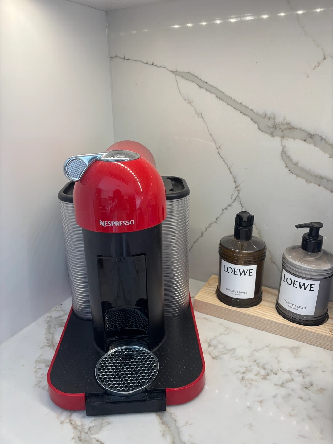 Make delicious coffee and espresso drinks with this Nespresso VertuoPlus machine. It's a sleek red and black model. In new condition, works perfectly. I can also give you some pods with the machine.