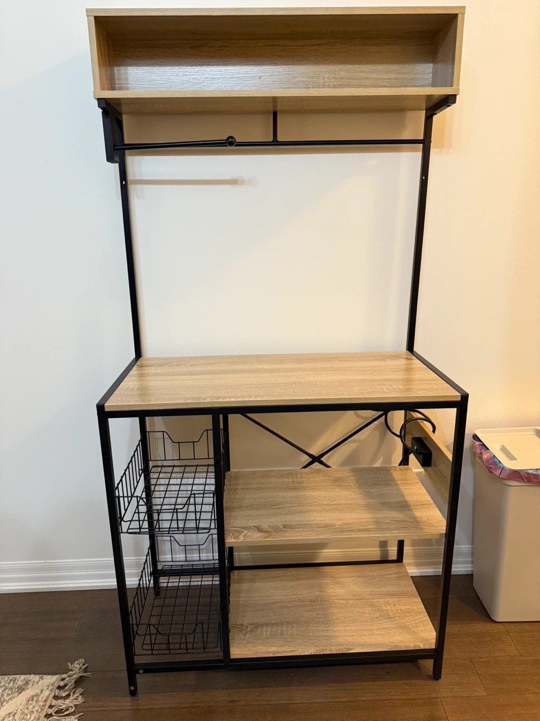 Looking to add some extra storage to your kitchen? This baker's rack is perfect! It features a top shelf, a hanging rod, a countertop, two additional shelves, and wire basket drawers. It's a great way to organize your kitchen essentials and keep everything within easy reach