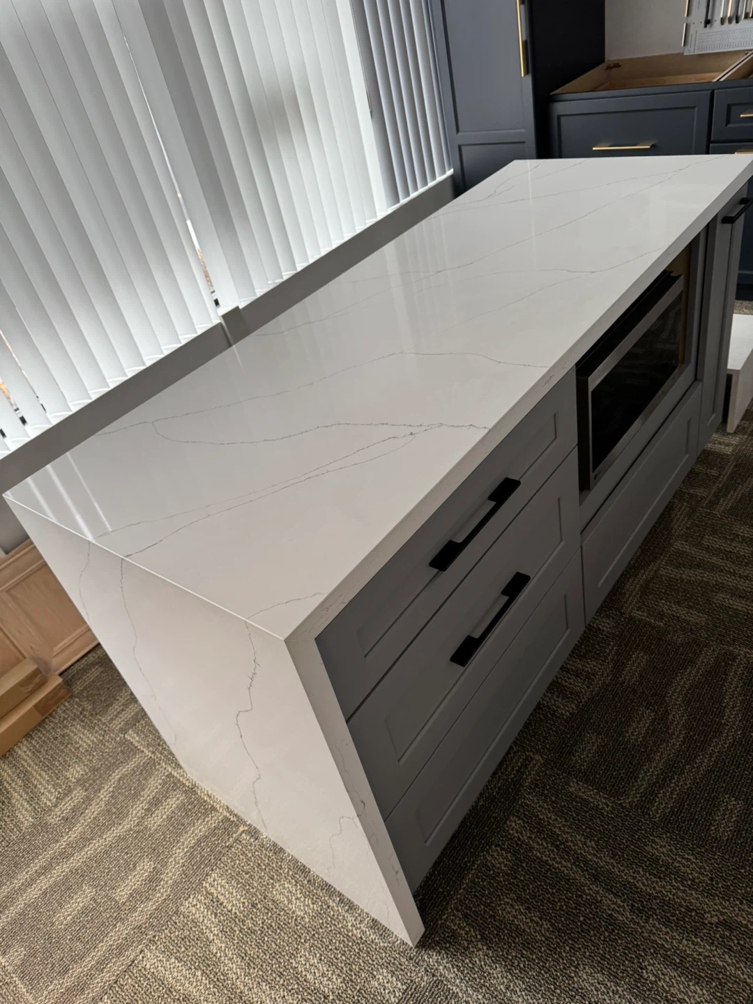 10Selling a brand new sample kitchen island featuring a high-quality quartz countertop with one side waterfall! The cabinets are made of solid maple wood and all plywood construction. Please reach out to see the sample in-person. Thank you Dimensions: - 72" L x 28" W - 36" H