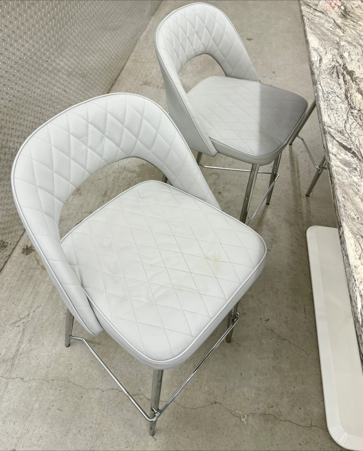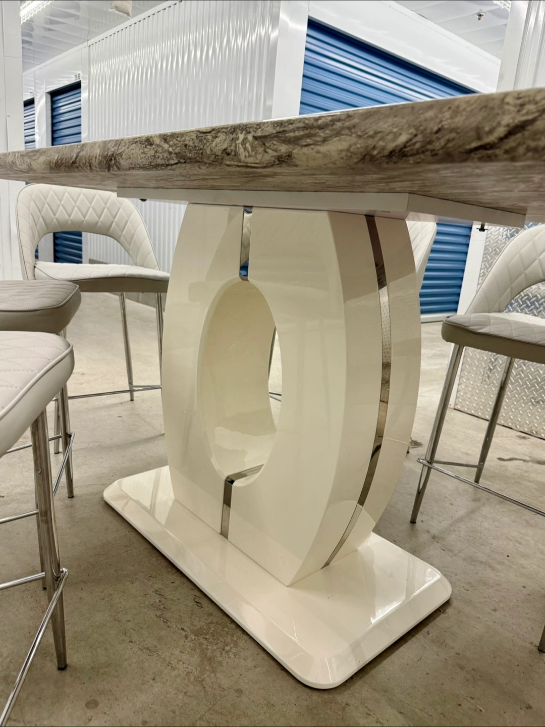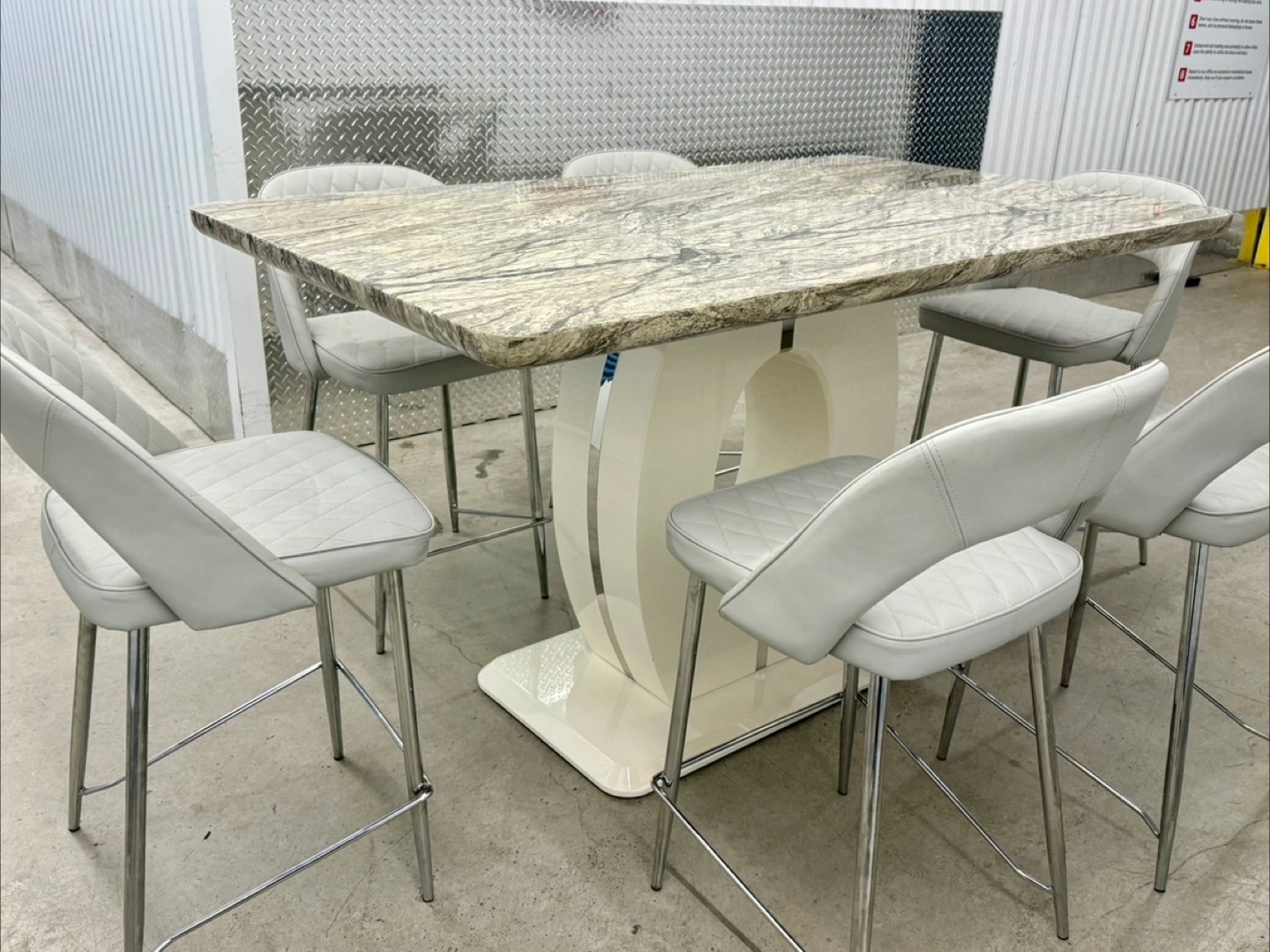 363Selling a beautiful dining table set that includes six stylish grey leather chairs. The table features a unique marble-patterned top and a modern white base. The chairs have a comfortable quilted design and chrome legs. Perfect for adding a touch of elegance to your dining space! Retail $ 1998.The table and chairs are in good condition. There are a few stains on the chairs that need to be cleaned. Please look through all the photos. Location: Queens Plate Dr , Etobicoke