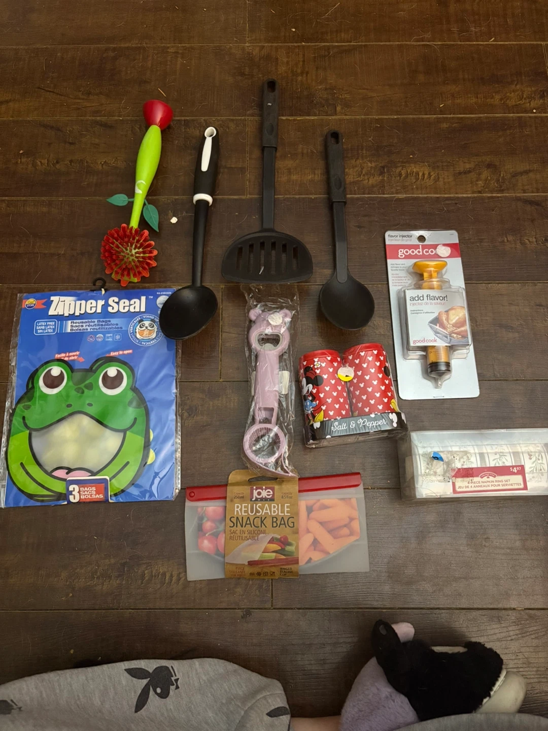 65A collection of kitchen items including: - Zipper Seal reusable bags (3 pack) - Joie reusable snack bag - Good Cook flavor injector - Disney Salt & Pepper shakers - Napkin ring set - Kitchen utensils