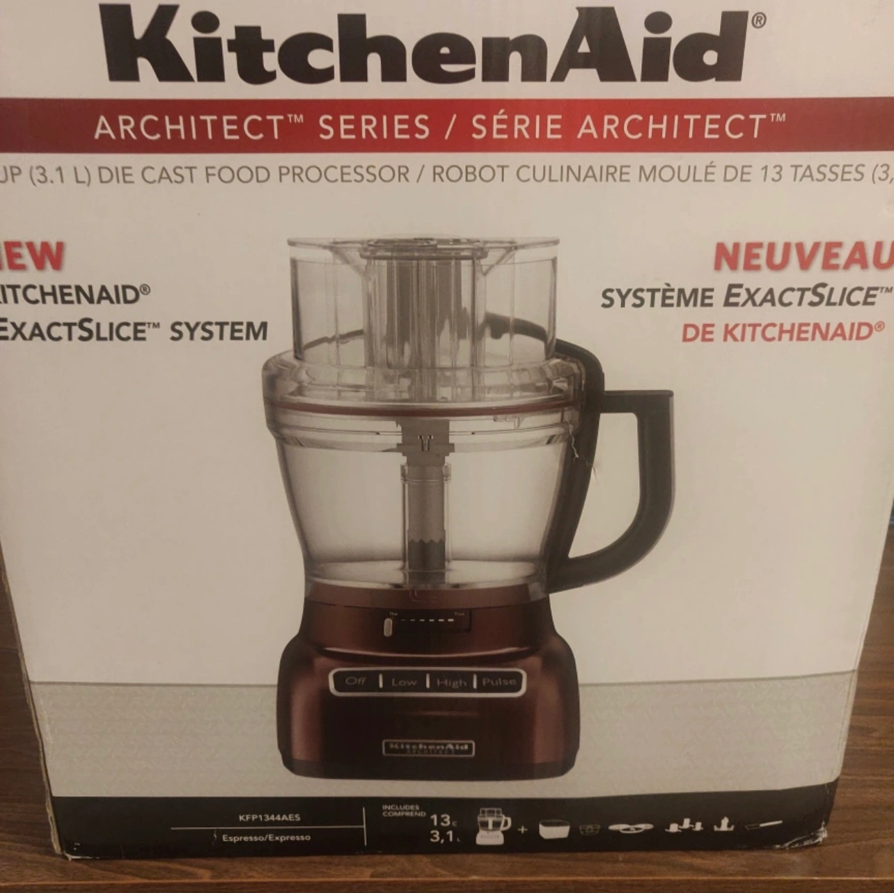 56ExactSlice System Model KFP1344AES *with a 3-in-1 ultra wide mouth feed tube*easily adjust from thin to thick slicing with the easy adjust external lever*optimized speeds to better results for soft and hard foods* 13 cup (3.1L), no parts missing, in good working condition, with user's instructions. *height 17" including everything