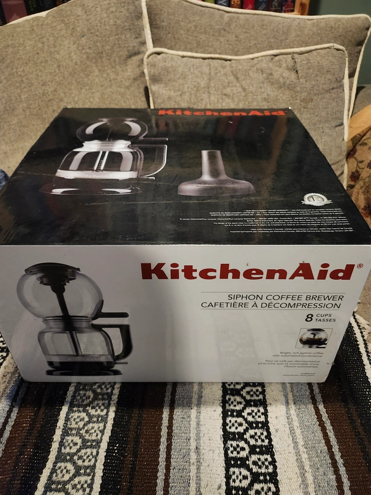 The box shows the coffee brewer. Appears to be a siphon type, in a box. Perfect for brewing a delightful cup of coffee in the morning for a calm start to your day.