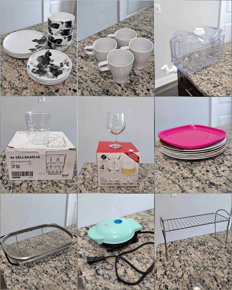 38Free or best offer. Waffle maker, water storage, plates, bowls. Everything needs to go by Sunday. Pick up near Square one Mississauga.