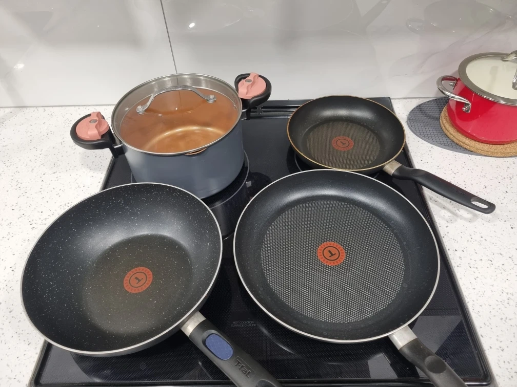 21A great set of 4 versatile pots and pans for sale. Non-stick surfaces and ready to use! 1 Large Frying Pan (Honeycomb Non-Stick) 1 Deep Wok Pan (Speckled Non-Stick) 1 Small Frying Pan (Standard Non-Stick) 1 Medium Pot with Glass Lid Cash and pickup only