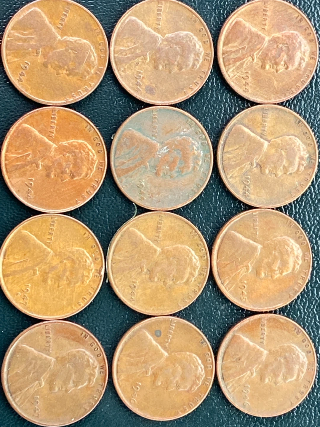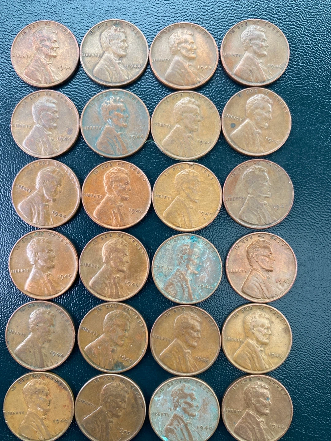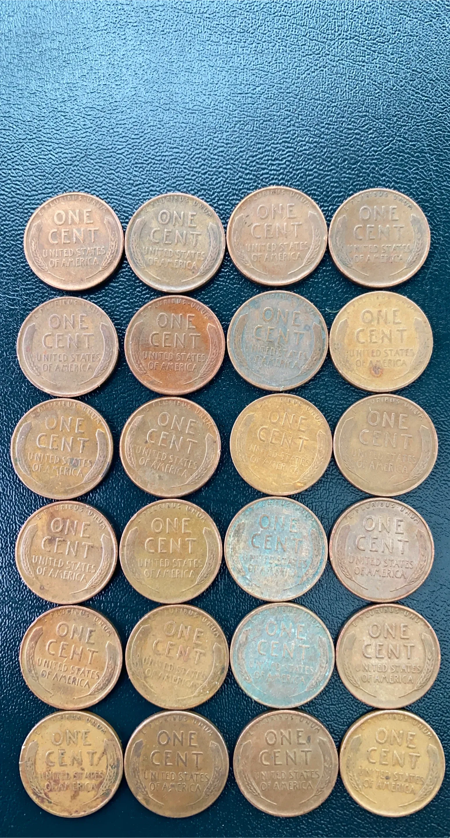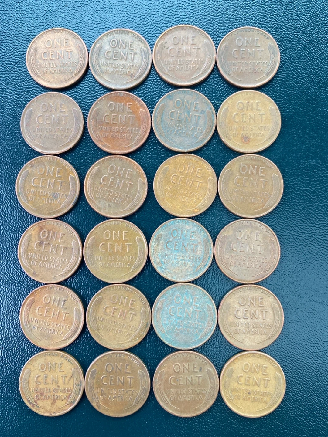 A collection of 25 United States one-cent coins featuring Abraham Lincoln. Many coins show visible dates ranging from the 1940s to the 1950s. Some coins exhibit a patina or verdigris, indicating their age. These pennies are primarily made of copper.