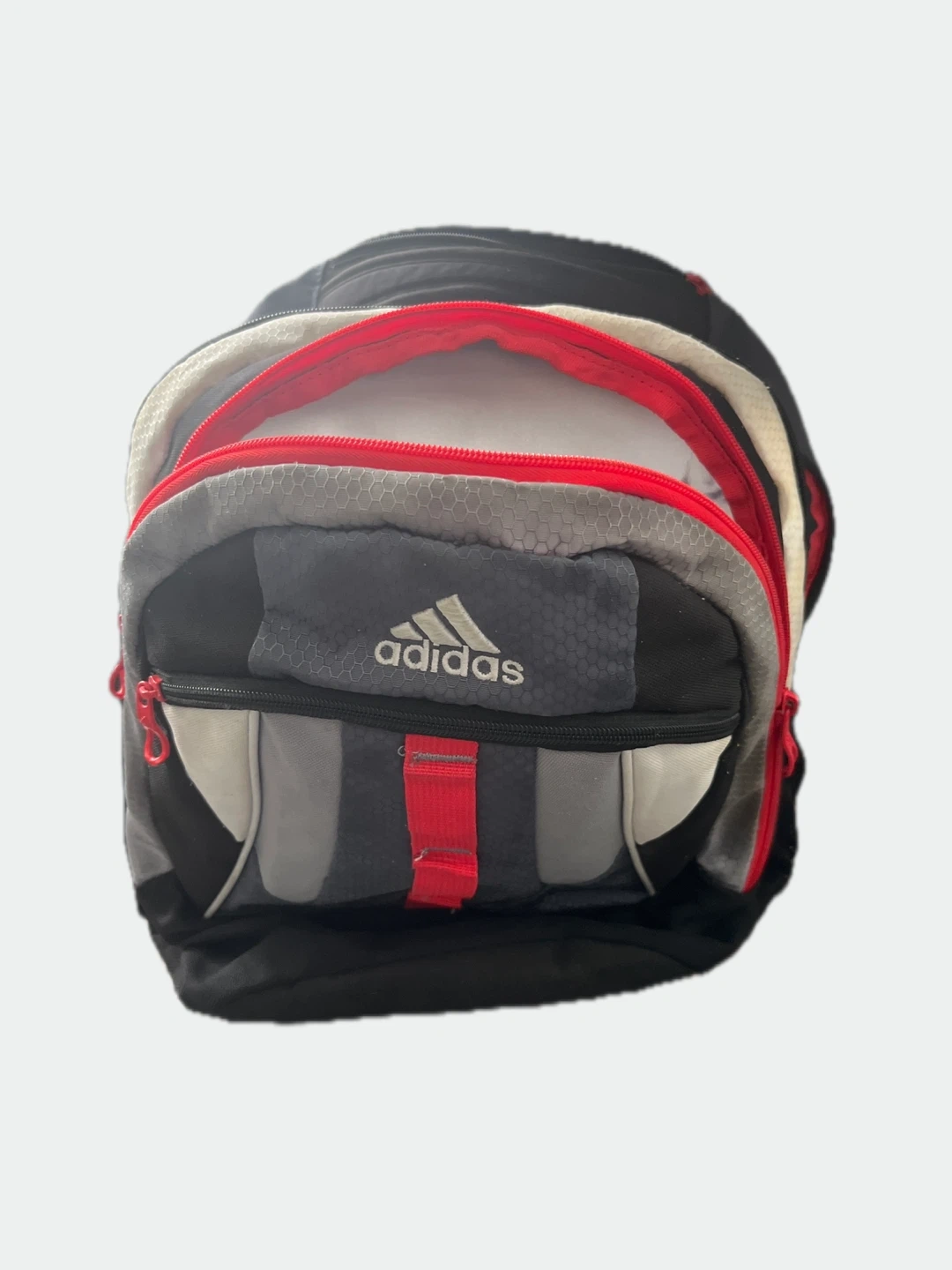 This is an Adidas backpack with multiple zippered compartments. It's black, grey, and red with the iconic Adidas logo. This backpack is great for carrying your essentials for school or sports!