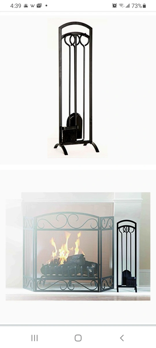 NEW 3-pc fireplace tool set. It's made of heavy-duty steel construction with a black finish. The stand is 28.5 inches tall and includes a shovel, brush, and poker.