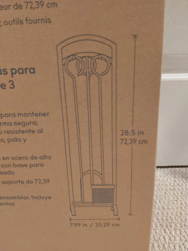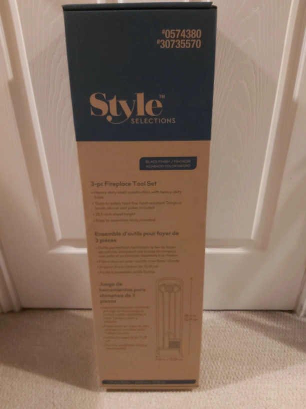 NEW 3-pc fireplace tool set. It's made of heavy-duty steel construction with a black finish. The stand is 28.5 inches tall and includes a shovel, brush, and poker.