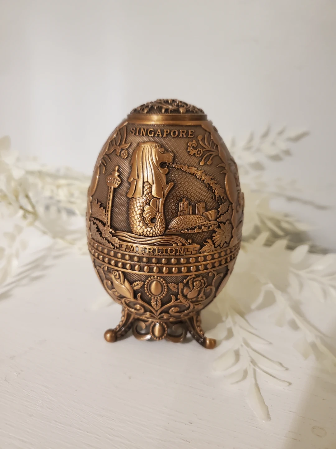 This decorative egg-shaped box features intricate embossed designs of Singapore landmarks, including the Merlion. It opens at the top to reveal a small storage compartment. It's made of metal with a bronze finish and stands on small decorative feet. You can use it to store toothpicks.